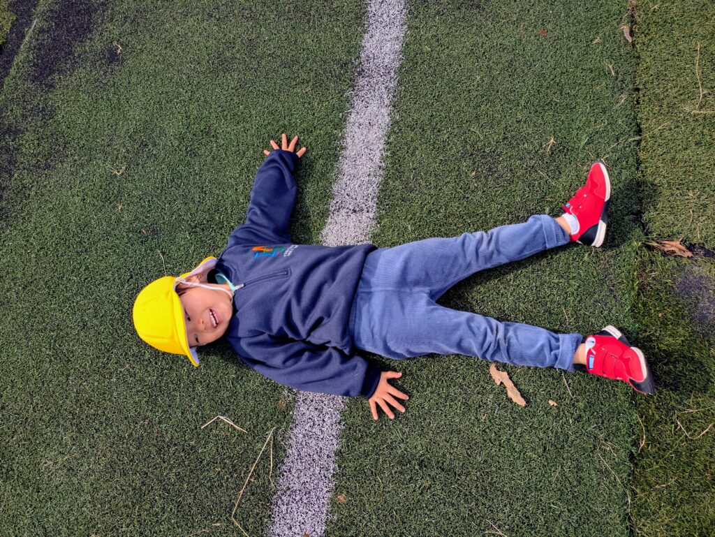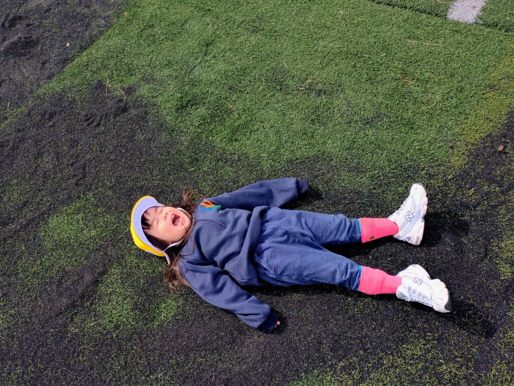 They also discovered that the kites would fall when there was no wind. Saying, “There’s wind over there!” they began to notice the direction of the wind and adjusted where they ran. It was great to see them enjoying and learning from nature through play.