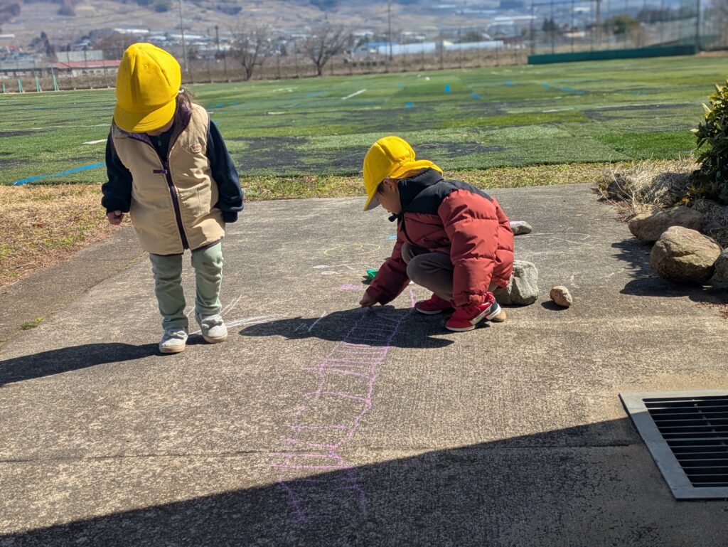 最後の週は、みんなで思いきり外あそびを楽しみました。チョークでお絵かきをしながら長い線路を描いたり、「一緒に描こう!」とお友だちを誘ったりして、みんなで楽しく遊ぶ姿が見られました。