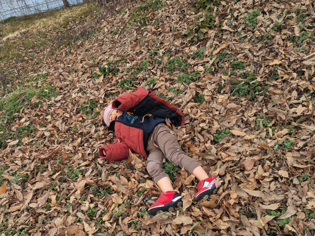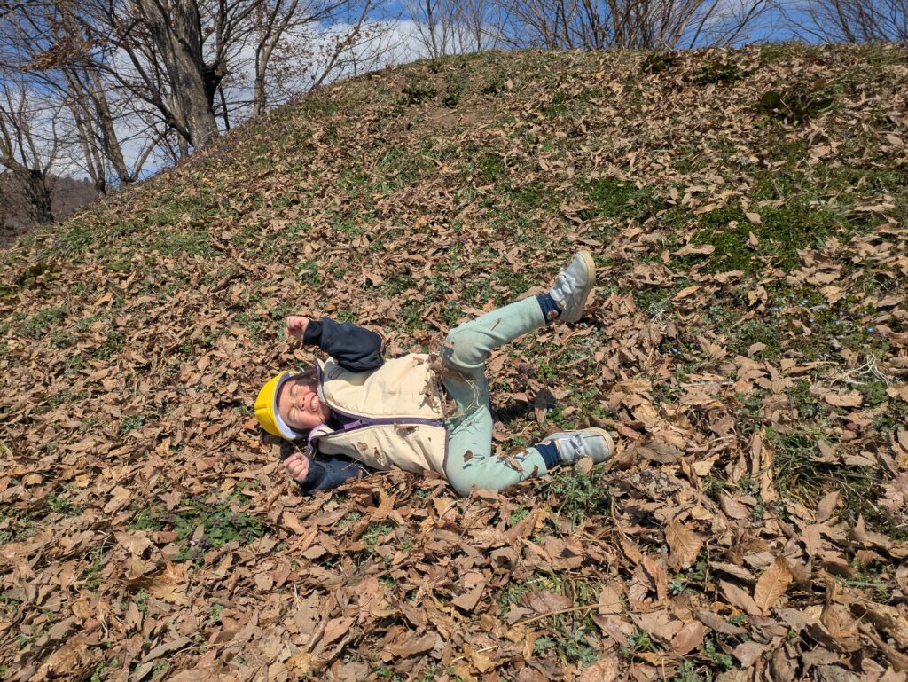 はじめの頃は、丘の上から寝転んで転がるのも少しドキドキしている様子でしたが、最後には自分からどんどん転がるようになり、成長を感じました。