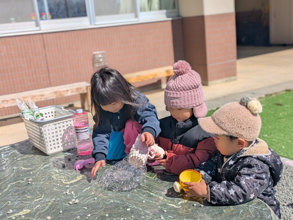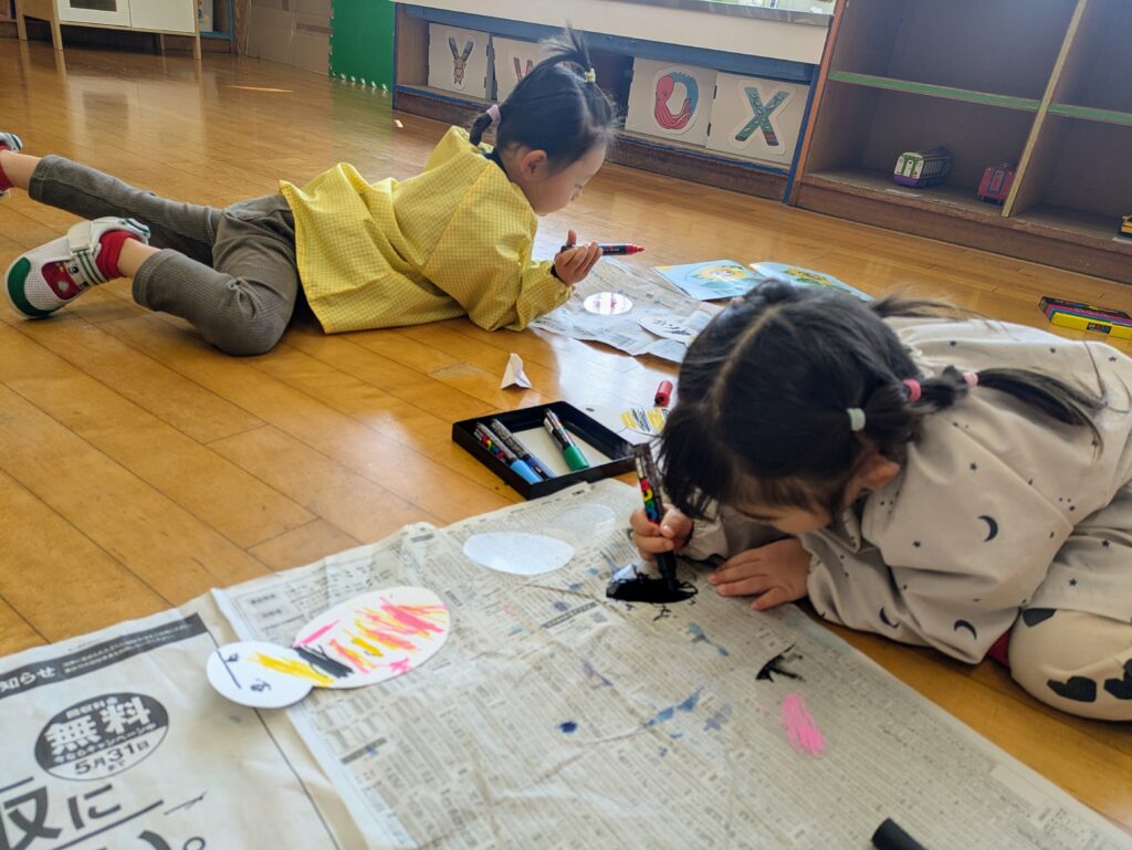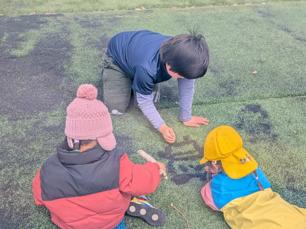In the final week, the children enjoyed playing outside together as much as they could. They had fun drawing with chalk, making long train tracks, and inviting their friends by saying, “Let’s draw together!” It was lovely to see everyone playing and creating together.