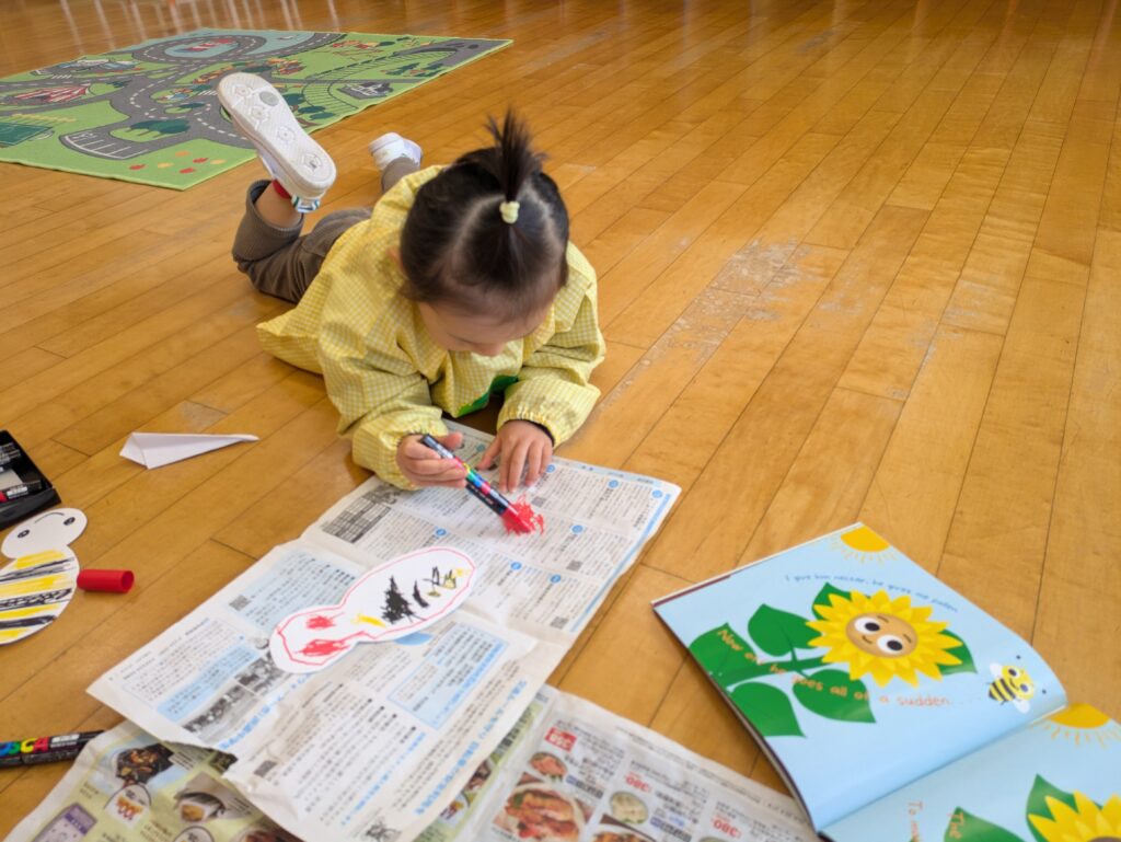 また、室内で作った蜂のクラフトも外に持っていきたいという子どもたちのアイデアで、一生懸命作った蜂を高いところから飛ばして遊ぶ姿も見られました。