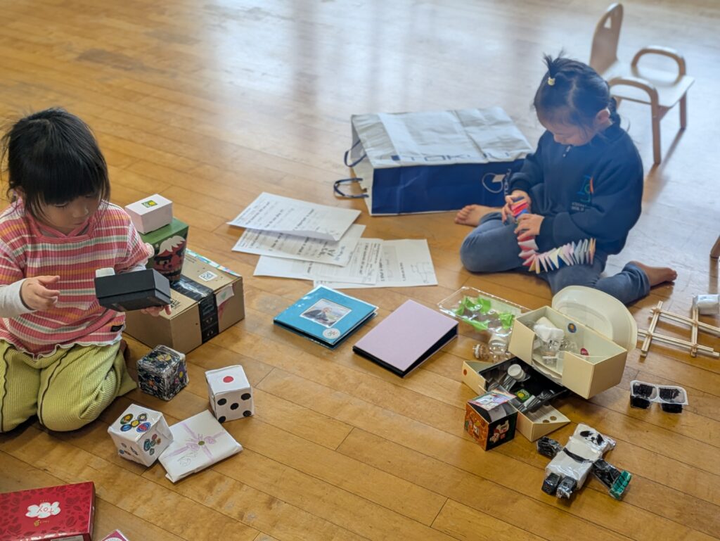 The older students gave them bags full of handmade toys as presents. After returning to the classroom, the children excitedly wondered, “What’s inside?” and carefully took out each item one by one. Their happy faces were very memorable.