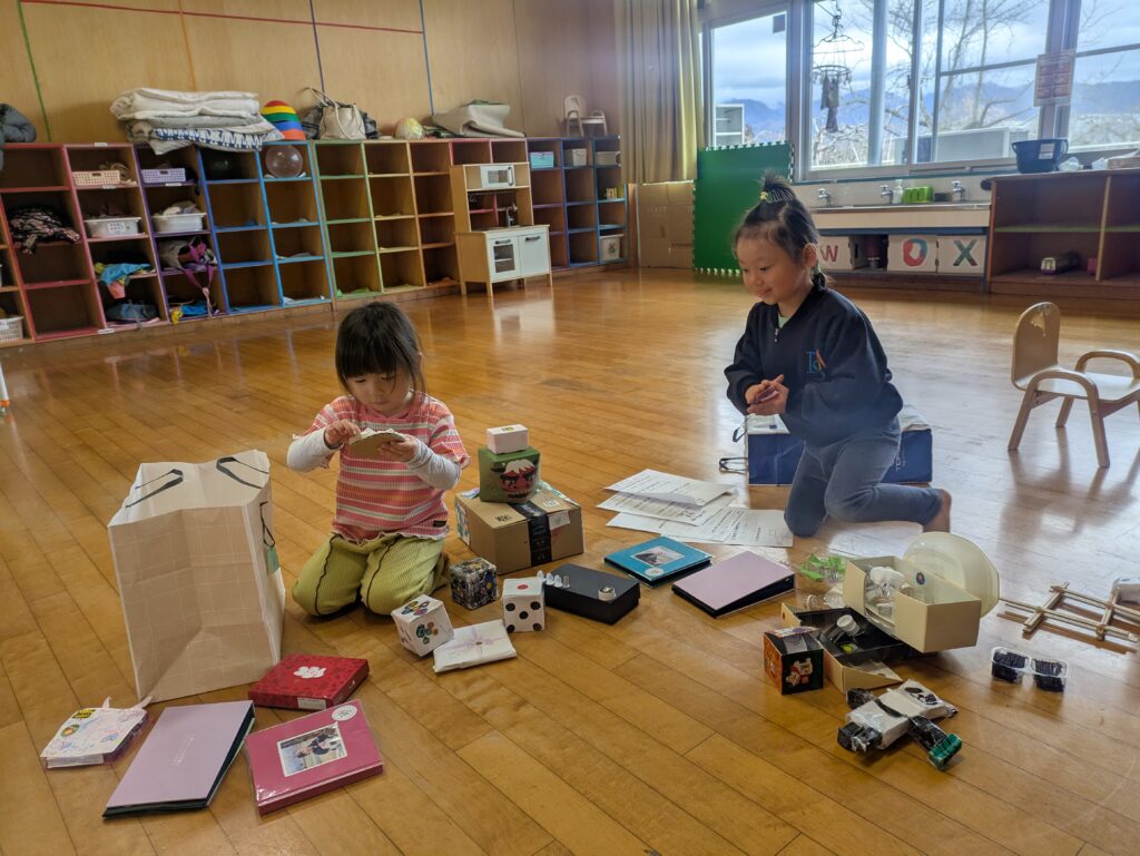 その後、輪になってプレゼント交換をしました。 みんなの前に立ち、しっかりと “I love you.” と伝えることができました。一生懸命作ったお花を一人ひとりに「どうぞ」と手渡ししていく姿も、とても微笑ましく、成長を感じる瞬間でした。 お姉さん・お兄さんからは、手作りのおもちゃを袋いっぱいにプレゼントしてもらいました。教室に戻ってから、「何が入っているのかな?」とワクワクしながら、一つひとつ大切そうに取り出して見ていました。とても嬉しそうな表情が印象的でした。