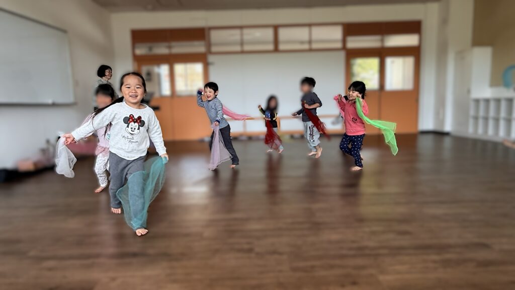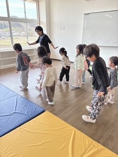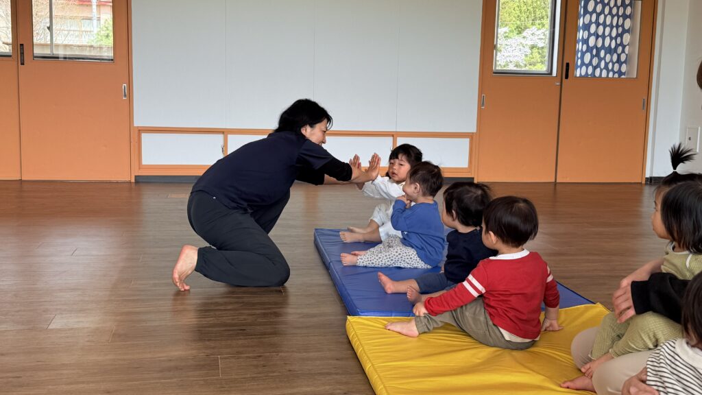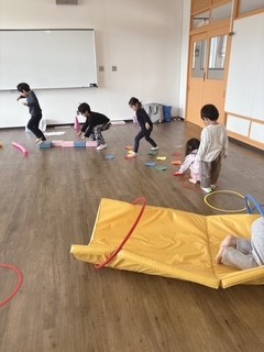 子どもたちは初めての体操クラスに参加し、とてもワクワクした様子でした。走ったり、ジャンプしたり、簡単な障害物あそびにもチャレンジしました。みんなで楽しく取り組みながら、良い関わりもたくさん見られました。
