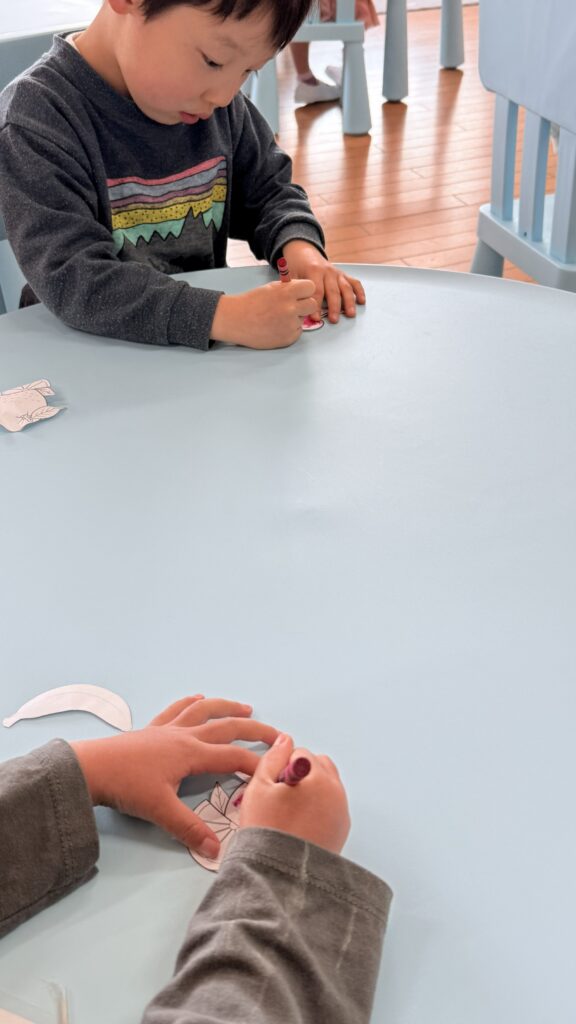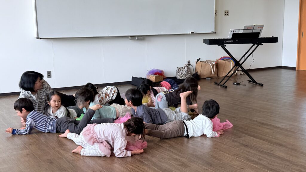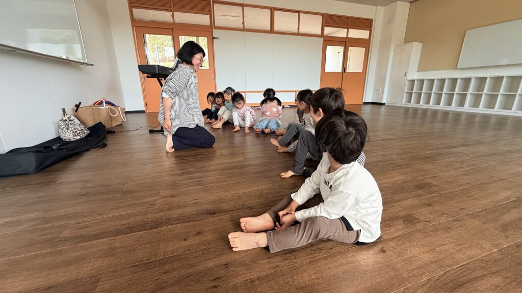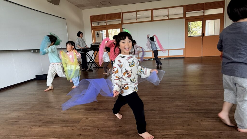 子どもたちは初めての音楽クラスに参加し、とてもワクワクしている様子でした。先生のお話をよく聞き、簡単な指示にもきちんと取り組むことができました。手をたたいたり、音楽に合わせて体を動かしたりしながら、楽しく活動していました。
