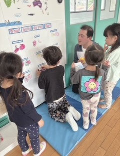 また、子どもたちは好きな果物に色をぬりながら、「What fruits do you like?」「I like〜」のフレーズを練習しました。その後、自分たちの作品を壁に貼りました。まだ文章を言うのが少し恥ずかしい子もいますが、一生懸命参加しようとしたり、活動を楽しんでいる様子が見られました。