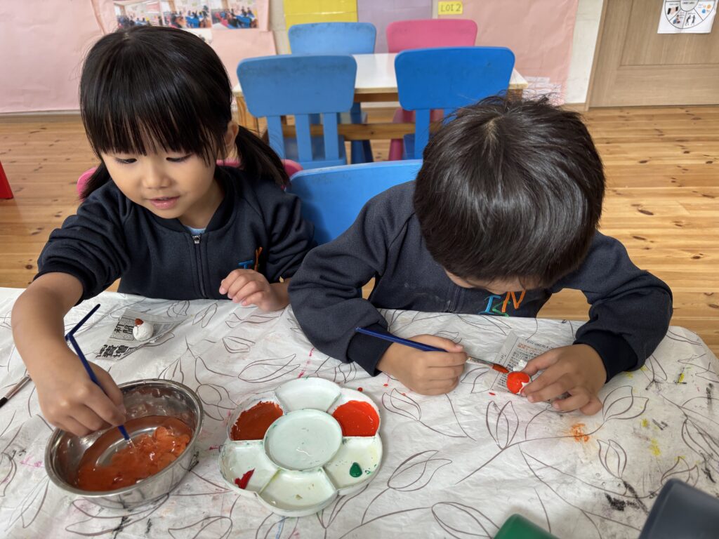 ジムレッスンでは、マット運動をしました。壁を使って逆立ちをしたり、お芋転がり、前転、後転などをしました。始めは出来るかなー?と不安に思っていた子も、お友達の声掛けや、先生のサポートで出来るようになると、とてもうれしそうでした!
