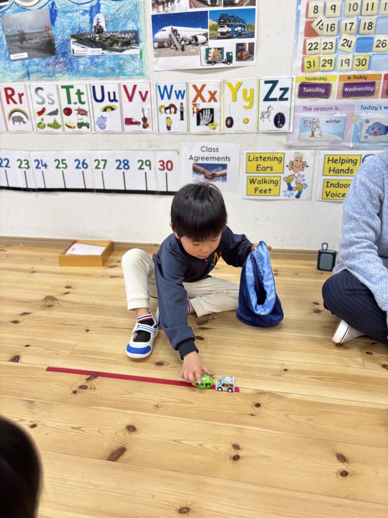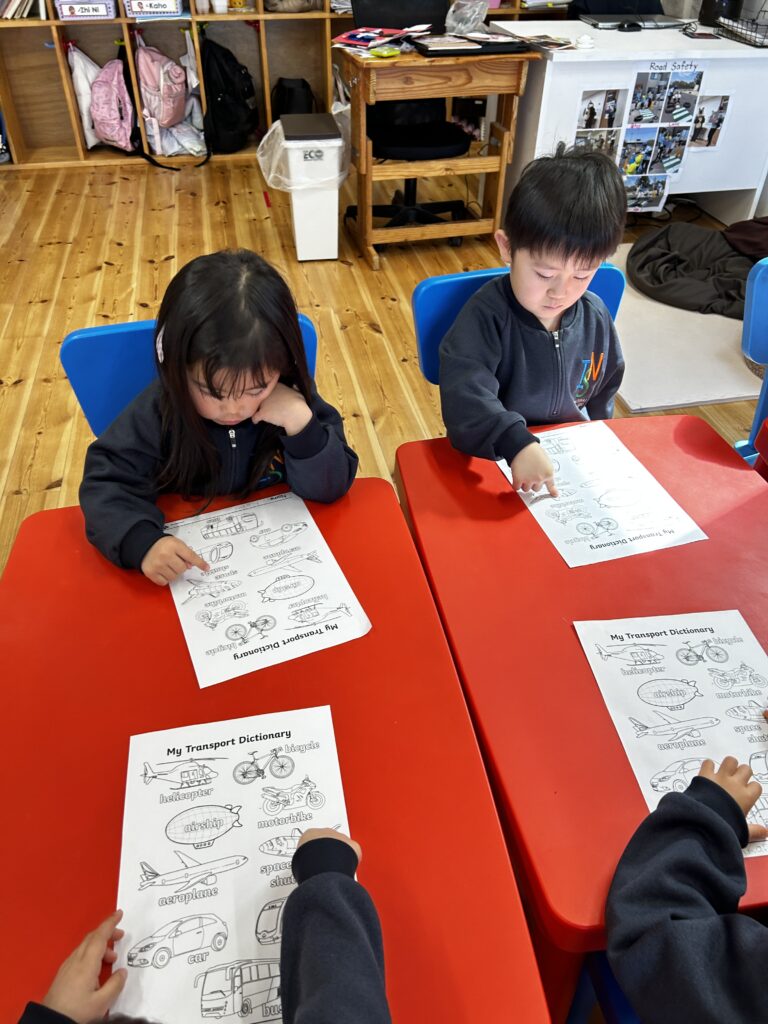 ファームトラクター、車を運ぶカーキャリアー、ウイングトラックと呼ばれるトラック、これらはすべて私たちのために物を運んだりと働いてくれる車です。キャニオンクラスでは、これらの車がたいてい大きなタイヤとエンジンでできていることも学びました。塗り絵になっている、”My Transport Dictionary”をクラスで作成し始めました。新しく、スペースシャトルやエアーシップなども知り、ボキャブラリーを増やしています。太字になっている、乗り物の名前にも色を塗りました。Show & Tellを通して、キャニオンさんたちはいろいろな乗り物の細部にまで気が付くようになりました!