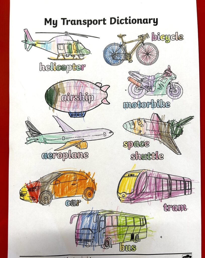 Farm tractors, car carriers, and wing trucks are work vehicles that transport our things and work for us. Canyon learned that these vehicles have big wheels and powerful engines. In My Transport Dictionary colouring sheet, airship and space shuttle were added to our vocabulary. We coloured in the names of the different transport too. Through our Show & Tell, Canyon reviewed their facts about the various vehicles – silver sports car,