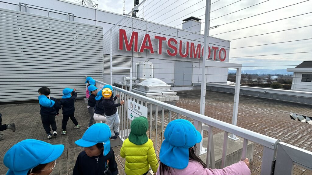 また、別の乗り物も見ました。空港内のサービスも、ツアーのようにして見て回りました。お土産屋さん、レストラン、チケットカウンター、面白いことがわかりました。信州まつもと空港の標高は657.5Mで、日本で一番お空に近い空港なんですって!