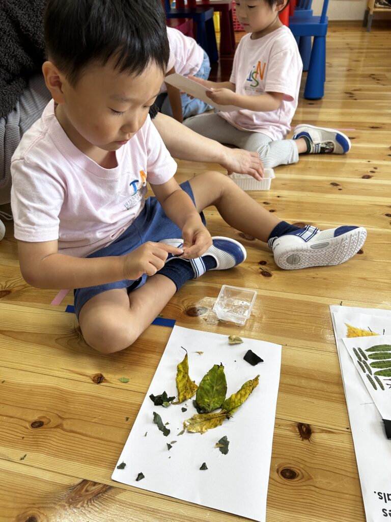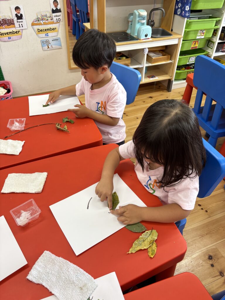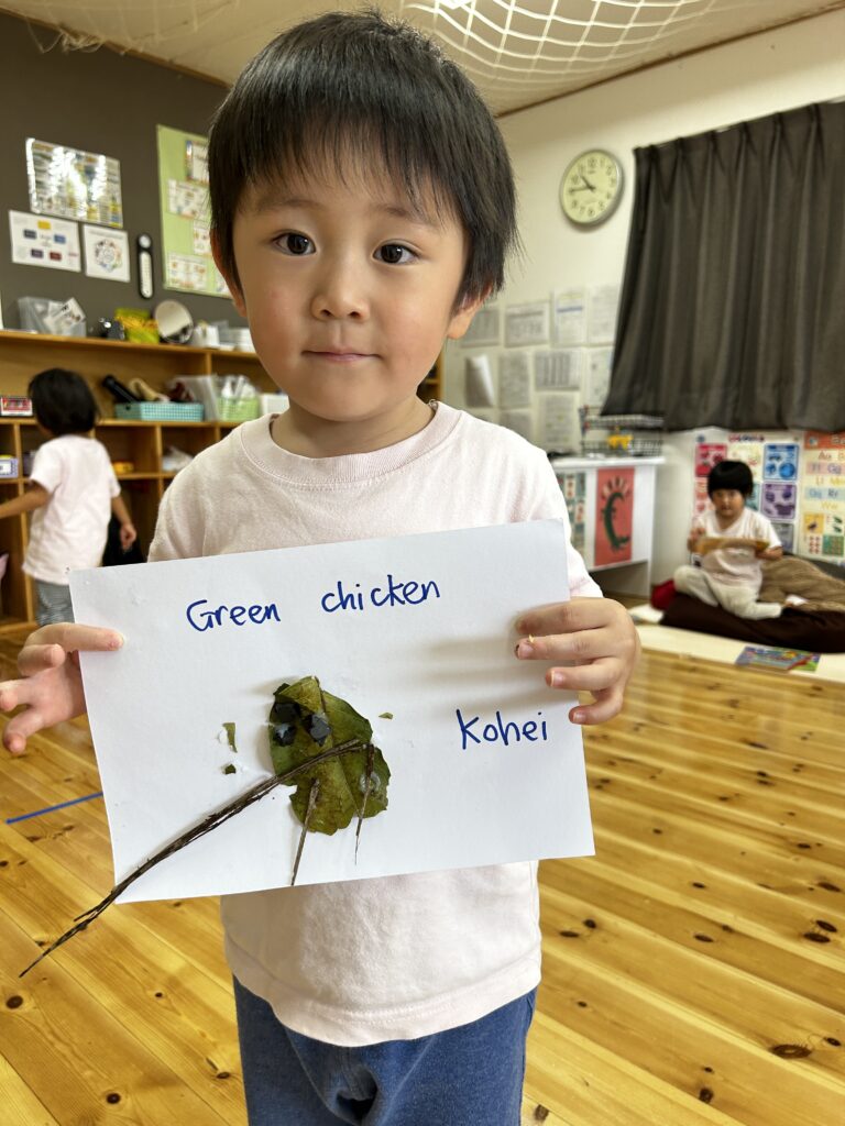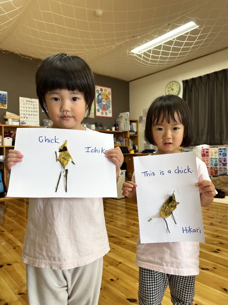 お散歩に出かけたときに集めた落ち葉や枝を使ってCraftをしました。キャニオンさん達にとって、初めてのコラージュクラフトです。動物の写真を見ながら子ども達の想像力を引き出し、自然のアイテムを使って動物を製作しました。黄色いひよこ、青いひよこ、ブラウンのフクロウ、ゾウ、などなどです!動物のお顔は?体は?羽は?しっぽは?などお話しながら楽しく制作しました。工作中は’leaves, twigs, sticks’という単語をたくさん口にしました。それに、’glue’ や ‘stick the leaves on the paper’という言葉も何度も言いながら制作活動を行いました。アートワークは、ボキャブラリーを増やしたり、子どもの好奇心を掻き立てるとても素敵なものです。どんな形の、(または色の)葉っぱが体にいいのかな?と考えたりしながら組み立てました。あら、これはくっつかない、もっとのりを使おう!こんなふうに一つずつ問題を解決しながら作業を進めていきました。Well-done!