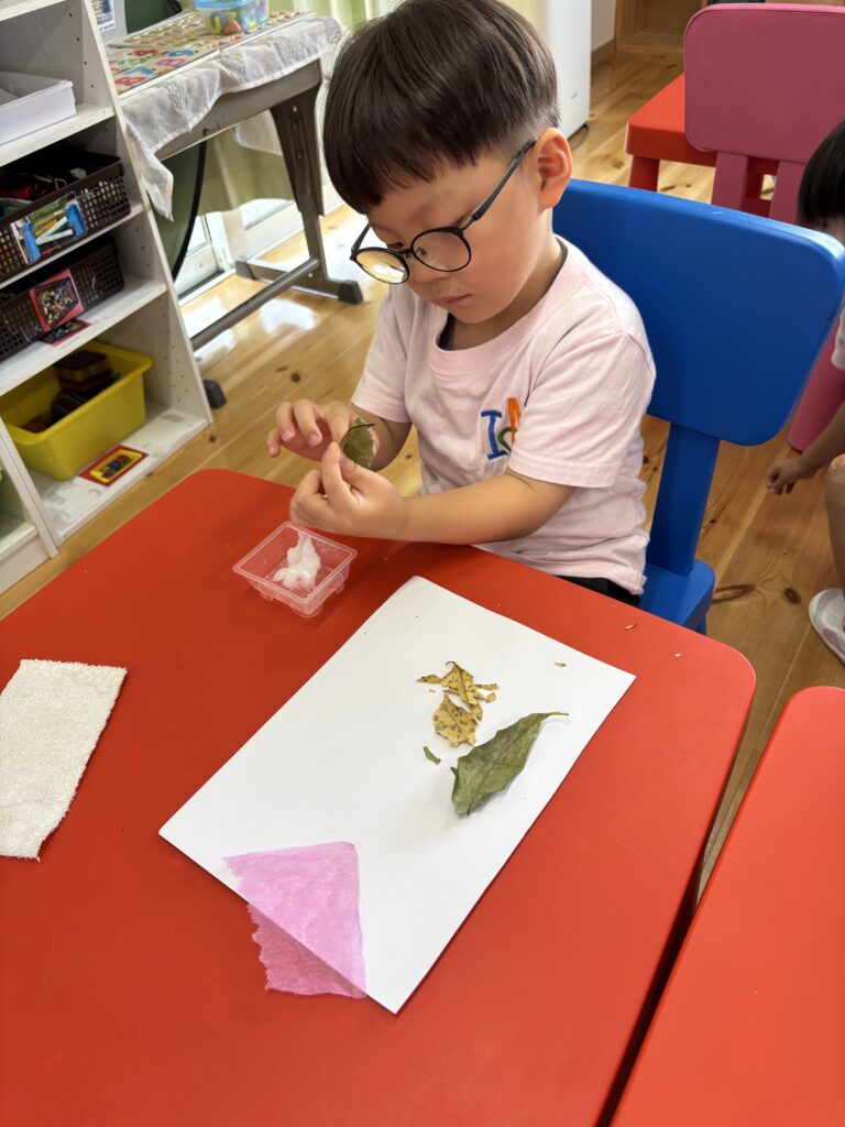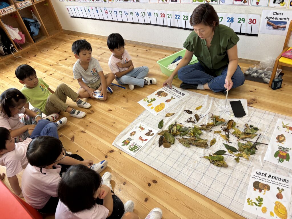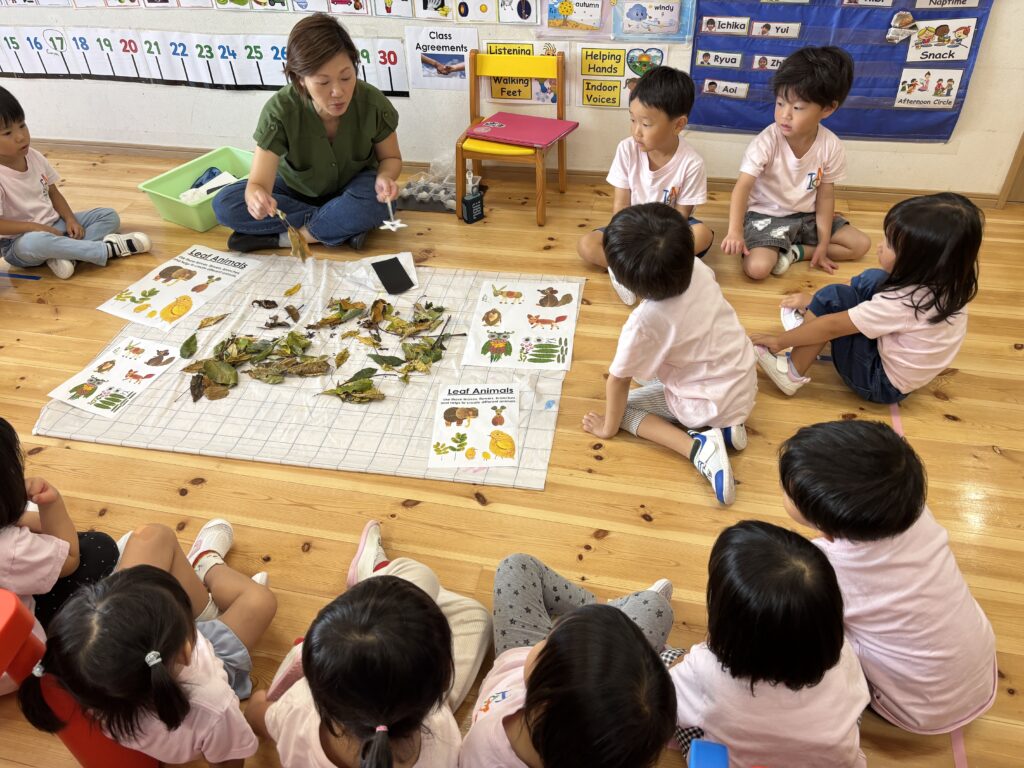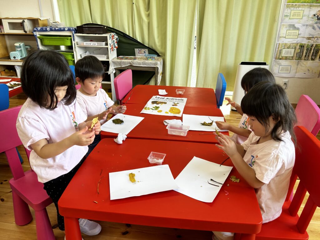 お散歩に出かけたときに集めた落ち葉や枝を使ってCraftをしました。キャニオンさん達にとって、初めてのコラージュクラフトです。動物の写真を見ながら子ども達の想像力を引き出し、自然のアイテムを使って動物を製作しました。黄色いひよこ、青いひよこ、ブラウンのフクロウ、ゾウ、などなどです!動物のお顔は?体は?羽は?しっぽは?などお話しながら楽しく制作しました。工作中は’leaves, twigs, sticks’という単語をたくさん口にしました。それに、’glue’ や ‘stick the leaves on the paper’という言葉も何度も言いながら制作活動を行いました。アートワークは、ボキャブラリーを増やしたり、子どもの好奇心を掻き立てるとても素敵なものです。どんな形の、(または色の)葉っぱが体にいいのかな?と考えたりしながら組み立てました。あら、これはくっつかない、もっとのりを使おう!こんなふうに一つずつ問題を解決しながら作業を進めていきました。Well-done!