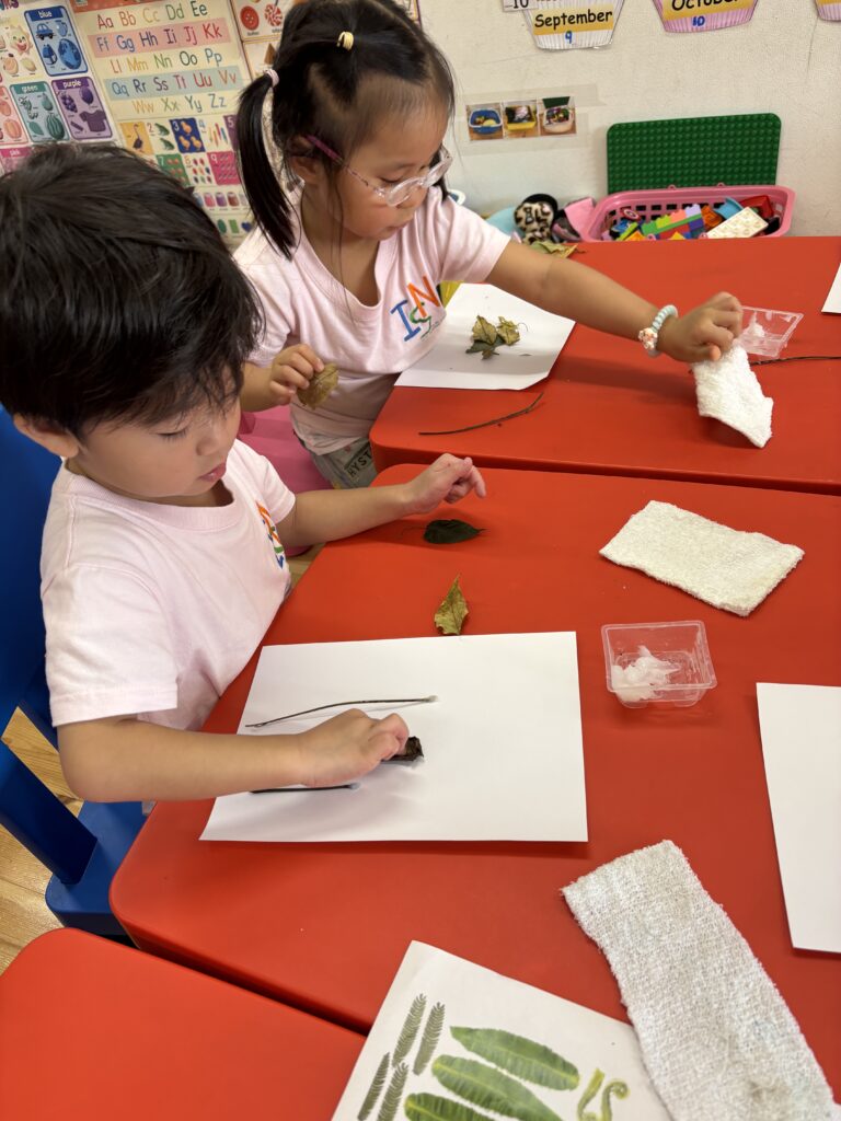 We picked some leaves and twigs when we went for a walk. This is Canyon’s first attempt at a collage craft. Using our imagination and referring to pictures, Canyon made interesting animals out of nature. Yellow chicks, green chicks, brown owls, an elephant, and more! We talked about the animal’s head, body, wings, tails. We used words like ‘leaves, twigs, sticks’. We used ‘glue’ to ‘stick the leaves on the paper’. Artwork is a rich vehicle for language use and inquiry. We think about what kinds of leaves for which part of the body. We problem solve – This won’t stick. Do I need more glue for this part? Canyon was so focussed in their work. Well-done!