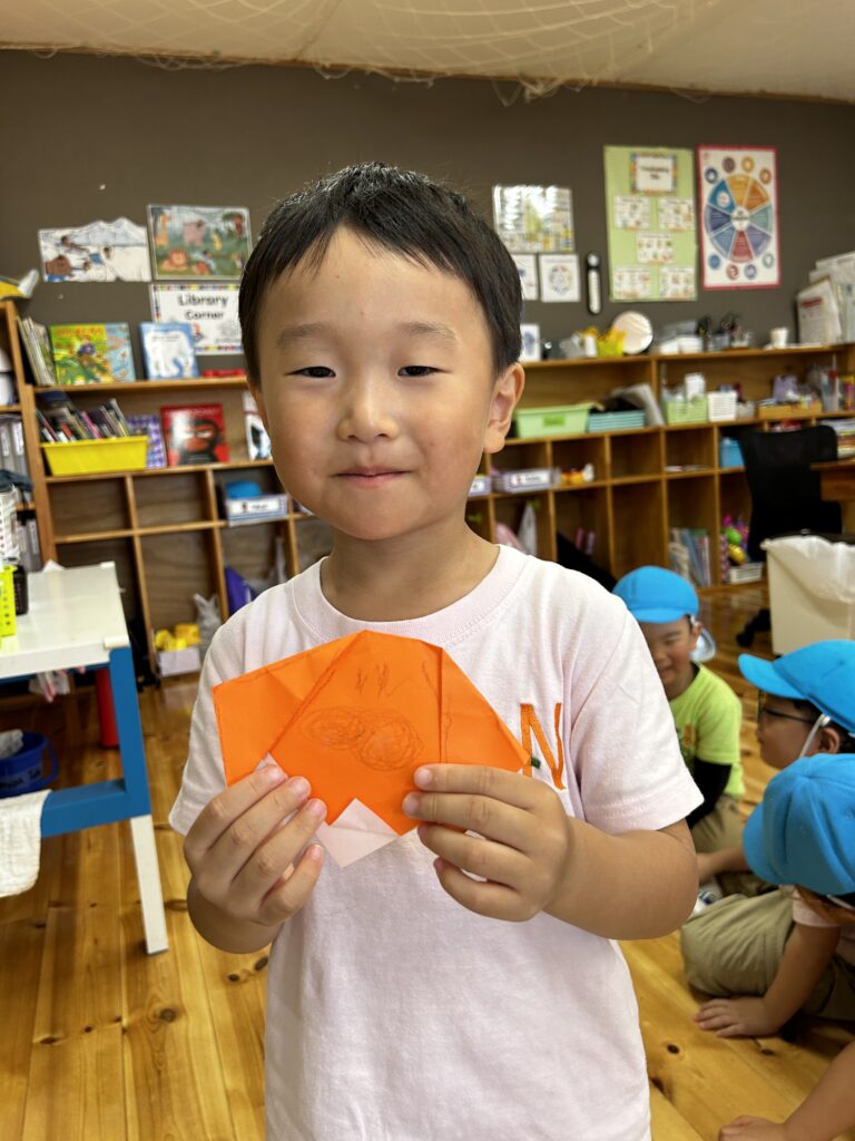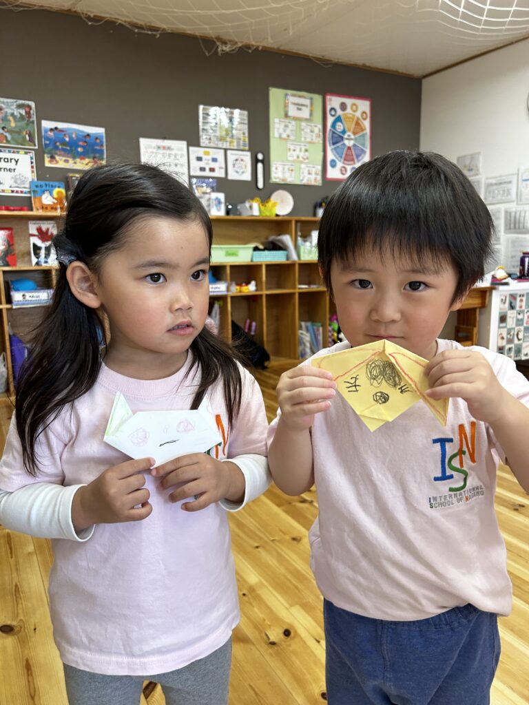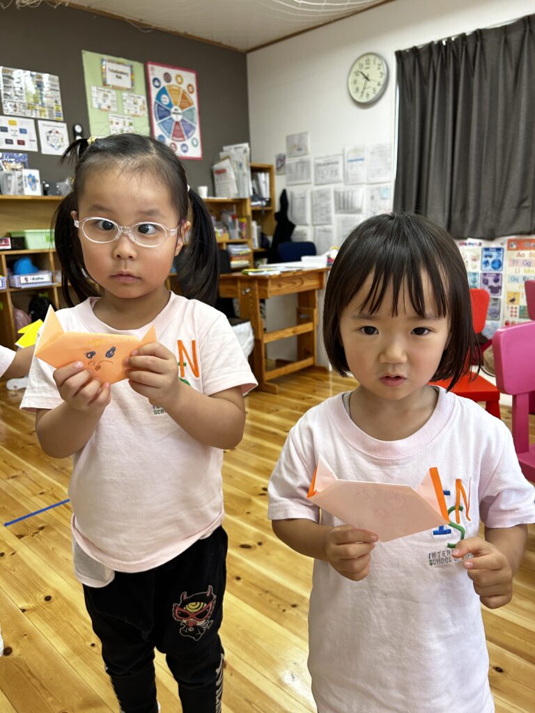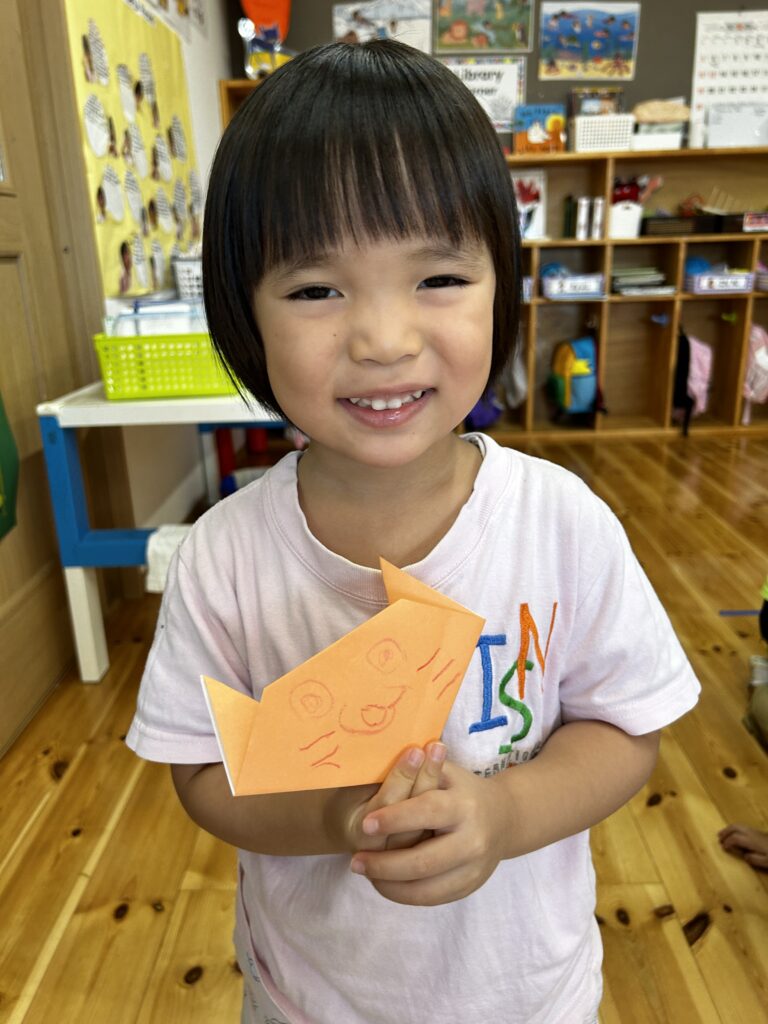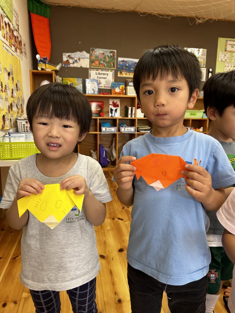 クラスに展示している動物の写真を数えました。なんと、47匹の動物がいました!それぞれの生息領域も様々です!動物とその動物がすんでいる地域をマッチさせるゲームをして楽しみました!また、折り紙を使って、犬や猫も制作しました。折り紙を折るときには、三角や四角がたくさんでてきましたよ!