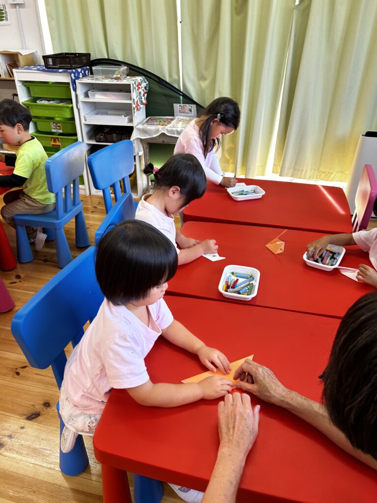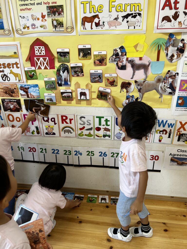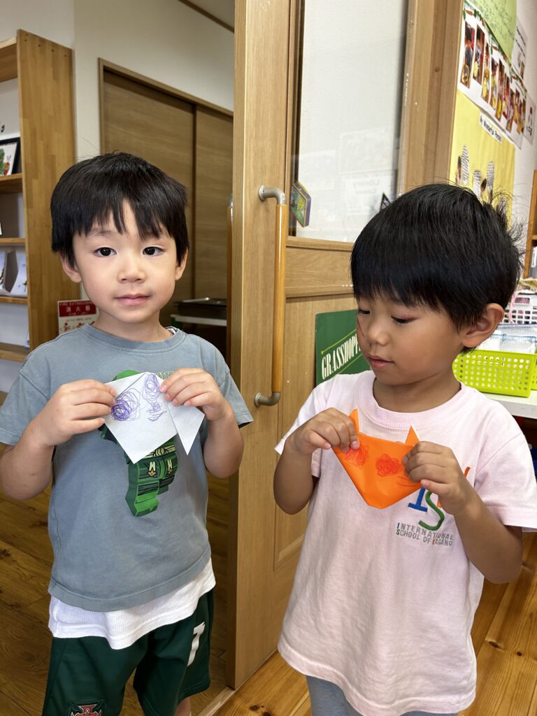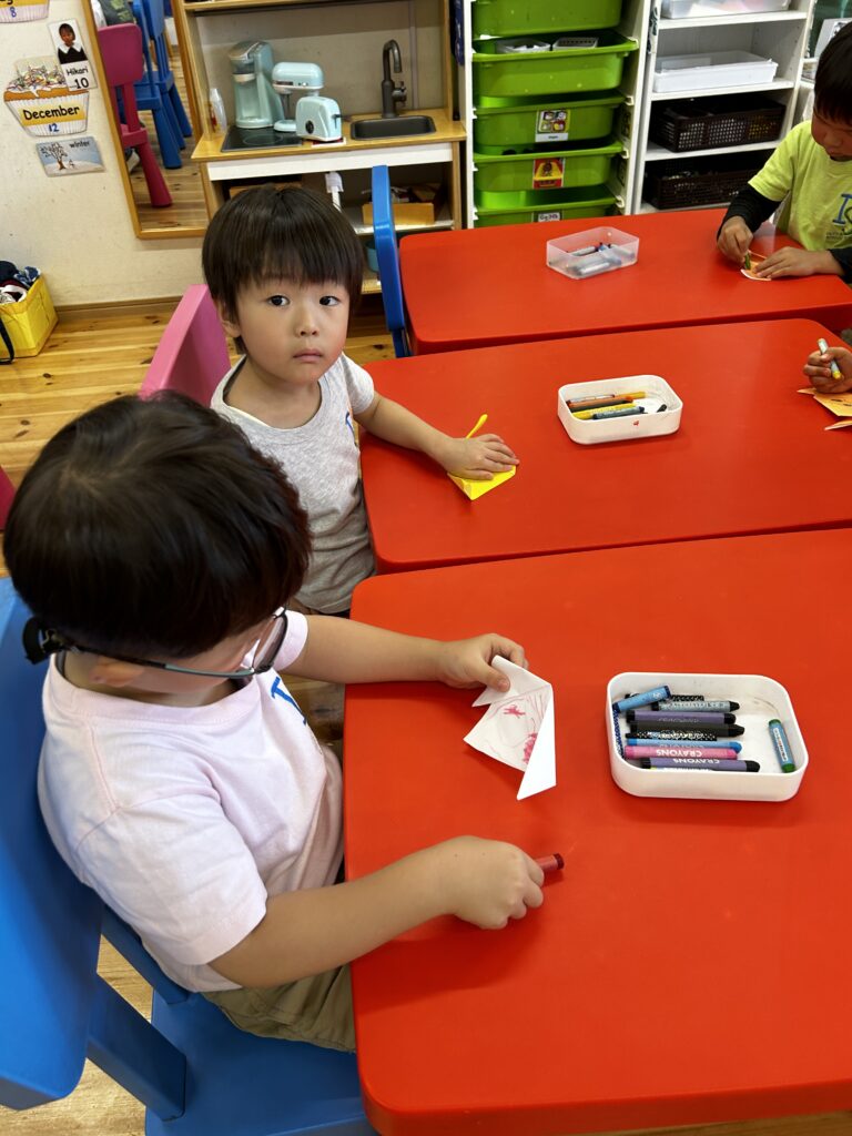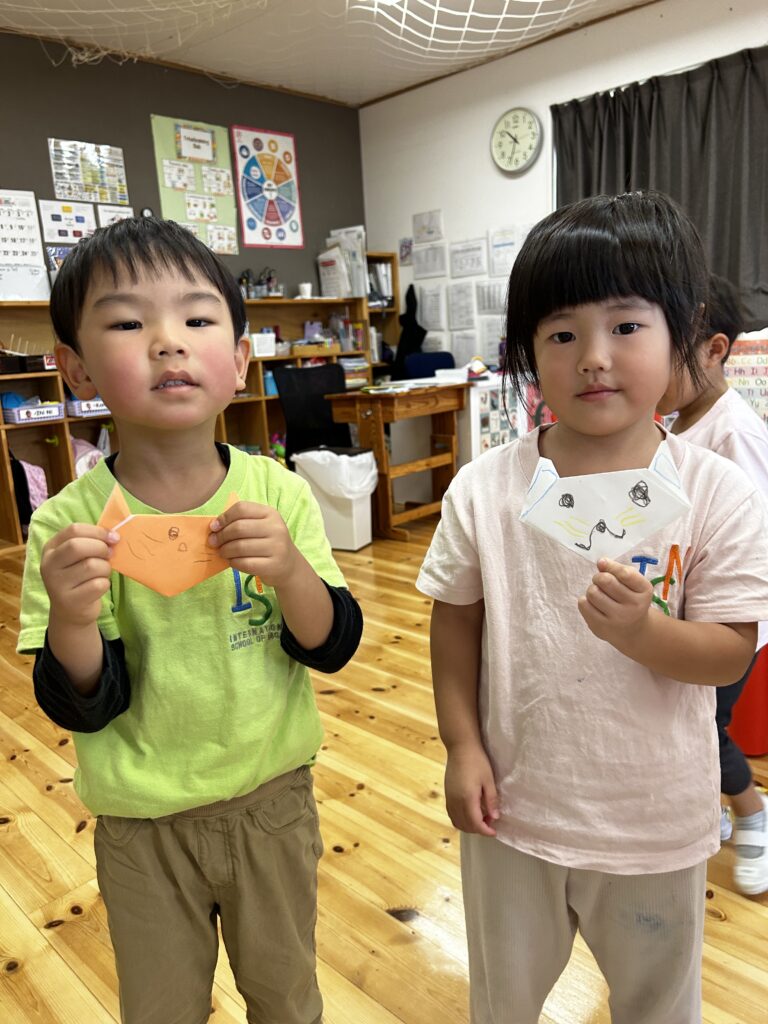 クラスに展示している動物の写真を数えました。なんと、47匹の動物がいました!それぞれの生息領域も様々です!動物とその動物がすんでいる地域をマッチさせるゲームをして楽しみました!また、折り紙を使って、犬や猫も制作しました。折り紙を折るときには、三角や四角がたくさんでてきましたよ!