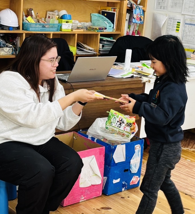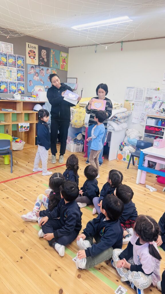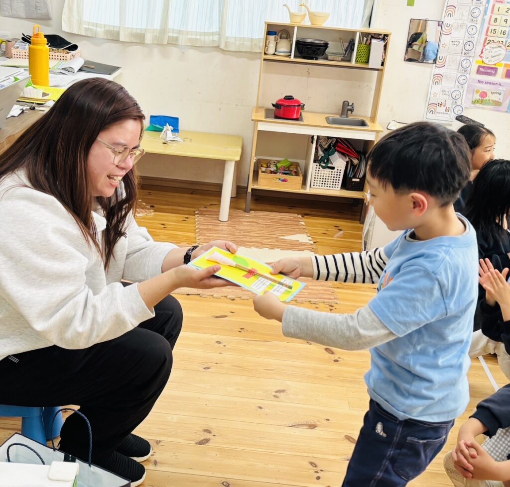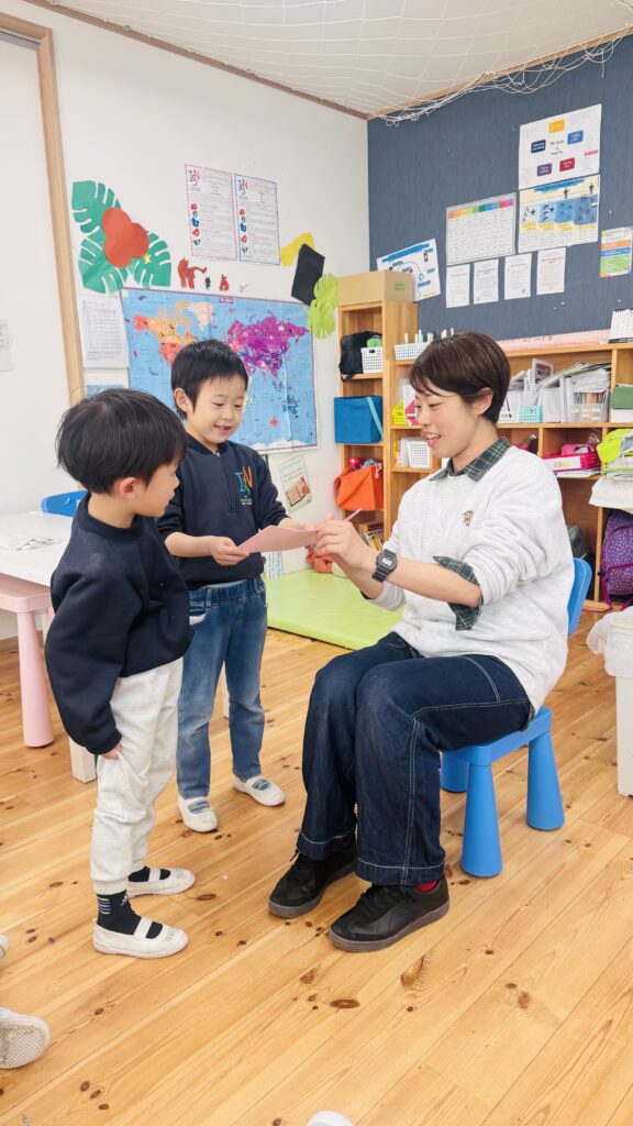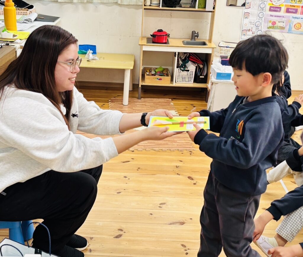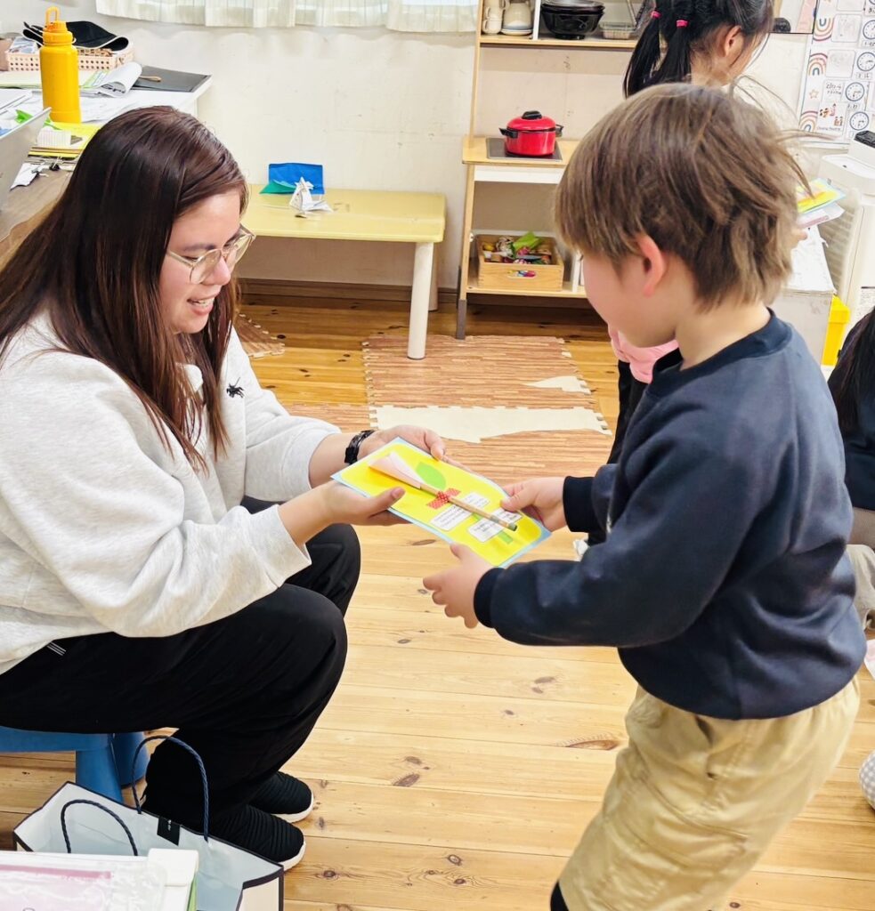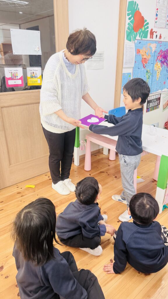 一日の最後に、Ms.AizaとMs. Shizukaから、メッセージカードを子どもたちに渡しました。小学校に行ってからも使える、鉛筆付きのカードです。絵を描いたり、文章や自分の思いを書くことが大好きなRainforestの子どもたちに、使ってもらえたらうれしいです♡