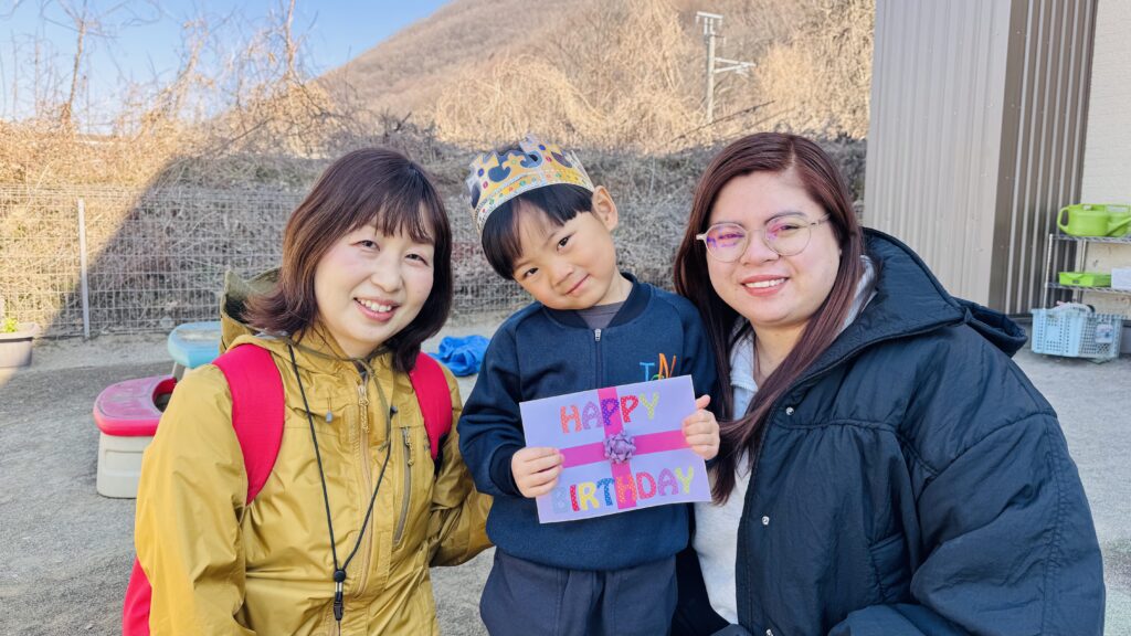 今週、3月生まれの子どもたちのお誕生日会を、気持ちの良い屋外で行いました。「Celebrations」の曲に合わせ、みんなでダンスをして楽しみました!