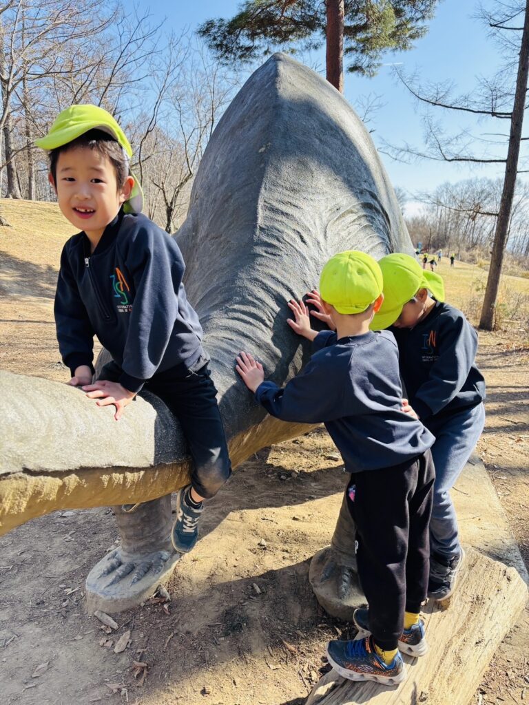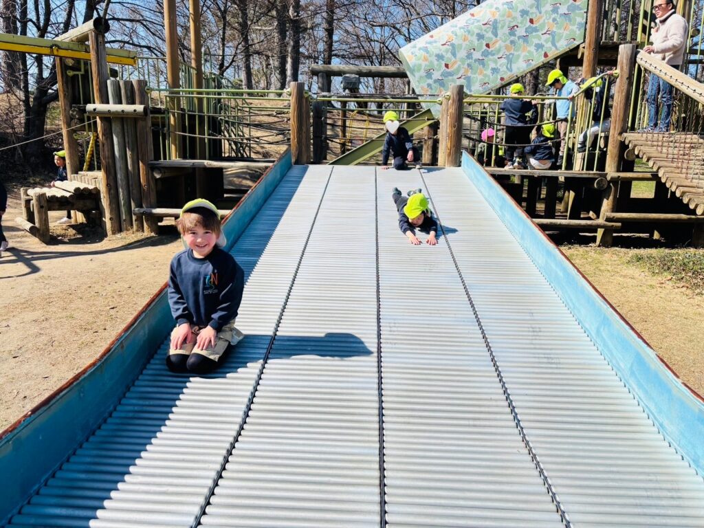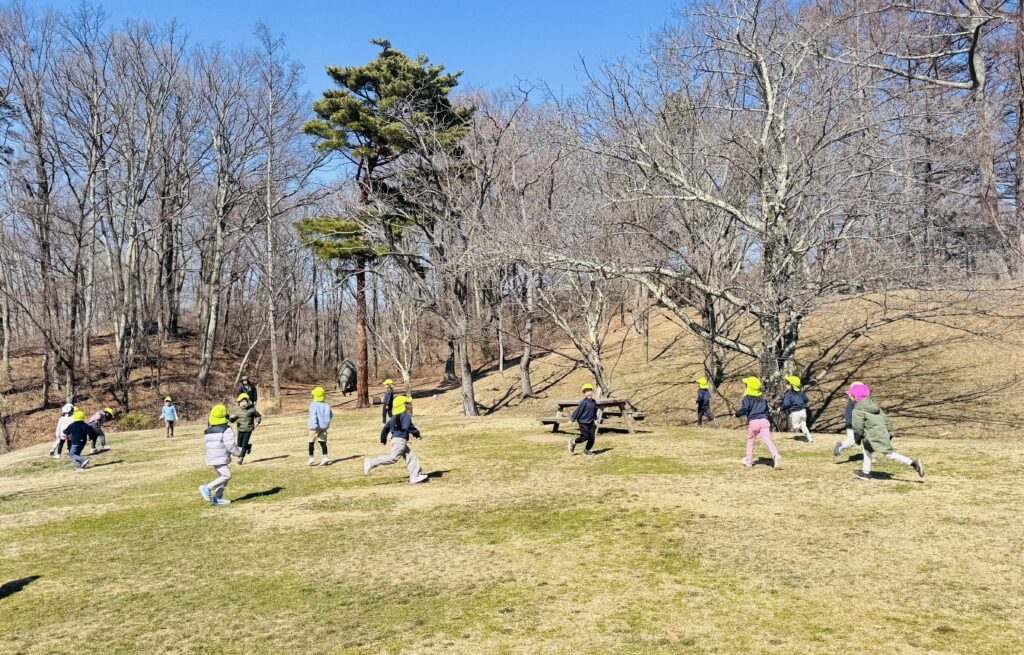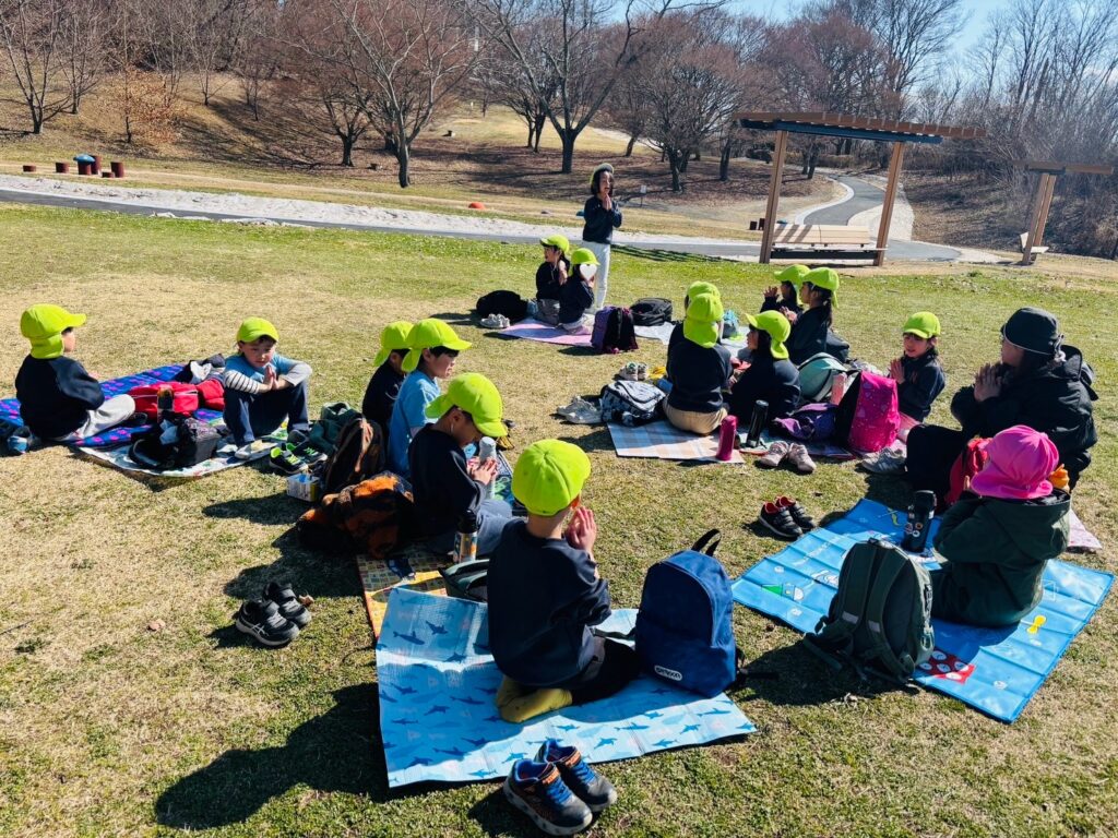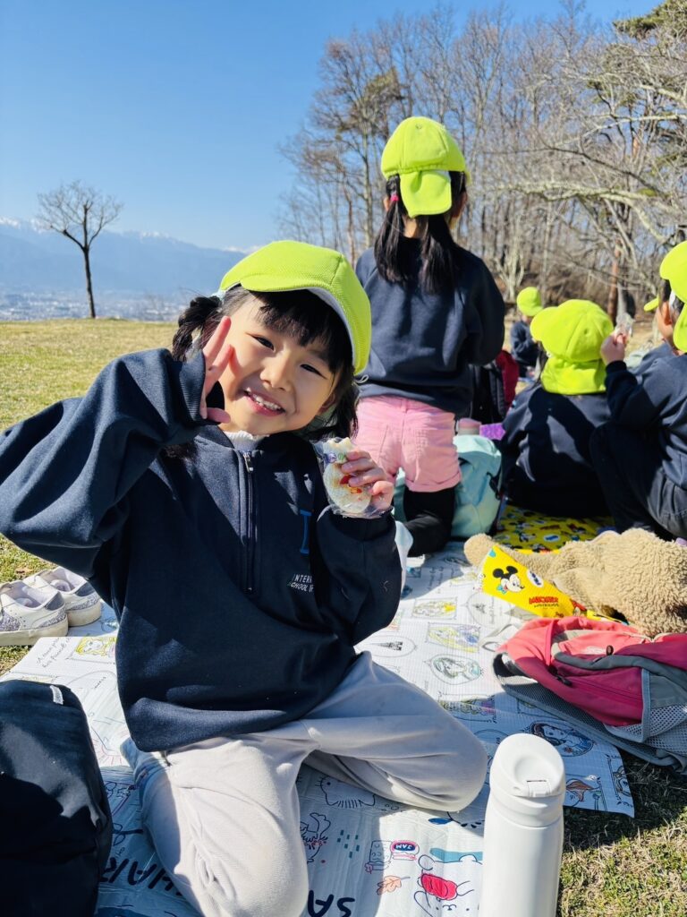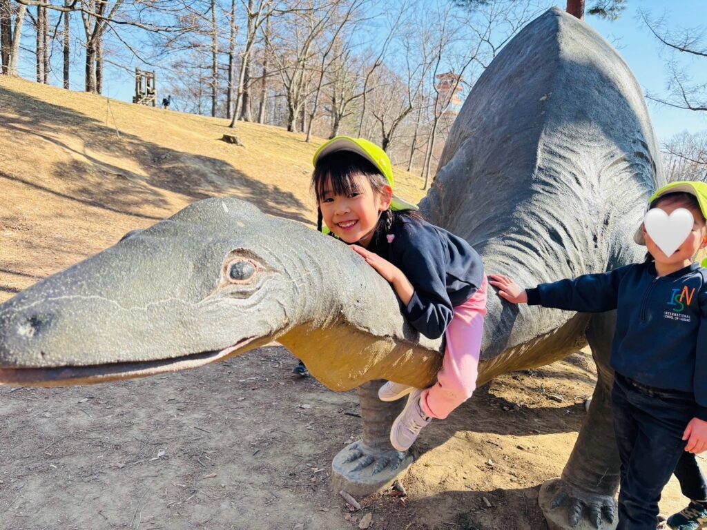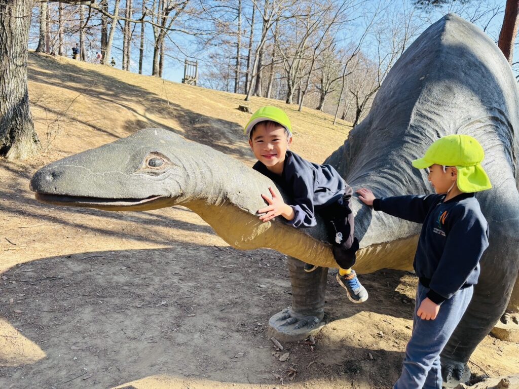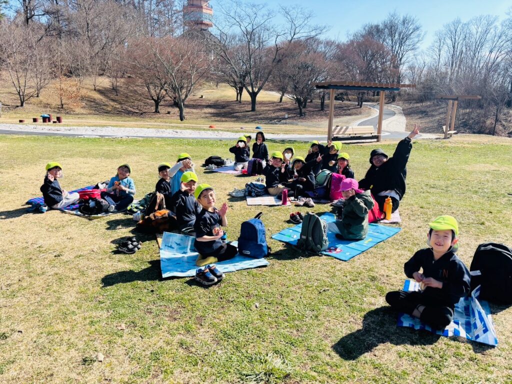 今週はRainforestクラスのみんなと過ごす最後の週。最後の思い出作りにアルプス公園にピクニックに出かけました。小さい頃は大変だった山道も、今のRainforestさん達はひょいひょいと登れちゃいます。広場で鬼ごっこをしたり、木の実を探したり、大きな恐竜に上ったり、遊具で遊んだりして楽しんでいると、あっという間にスナックタイム。みんなでシートを広げ、仲良くスナックを食べました。食べ物をとってしまう2羽のいたずらカラスがいると聞いて、「カー!カー!」と威嚇をしたり、おやつの入ったカバンをみんなのバックで一生懸命隠したりと必死な子ども達。素晴らしいチームワークのおかげで無事みんなのおやつは守られました。最後にまたひとつ、素敵な思い出が増えました。