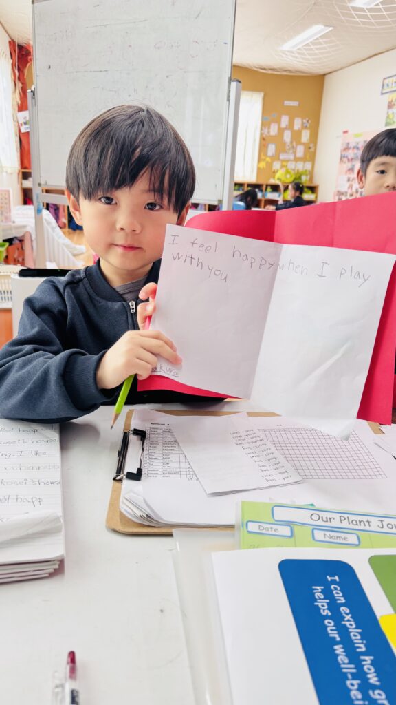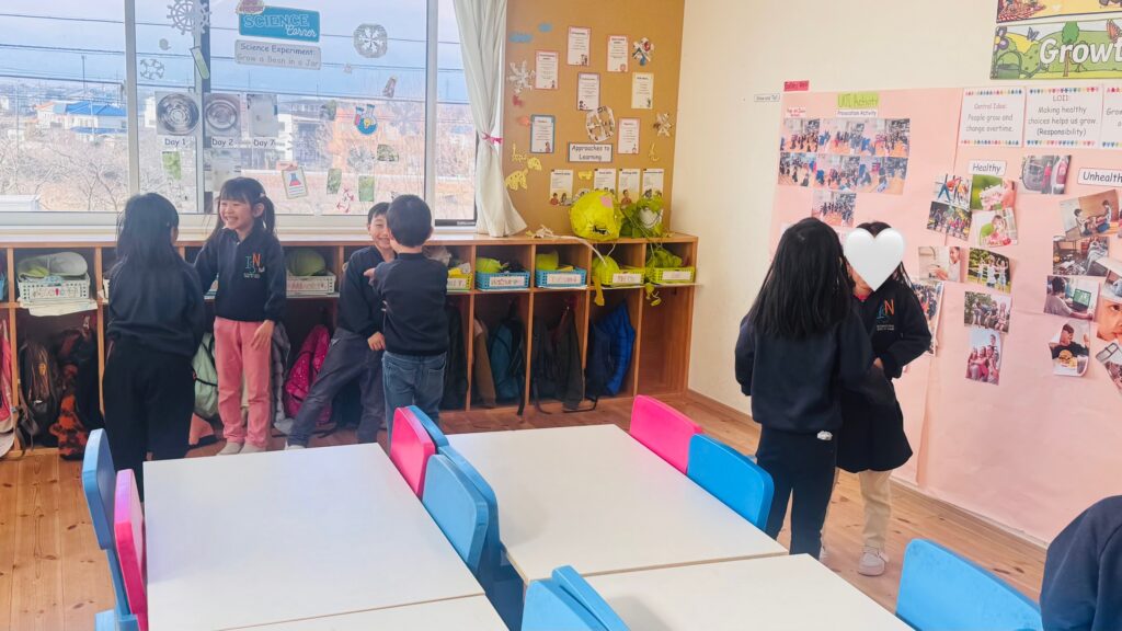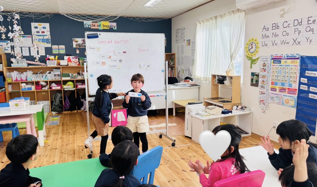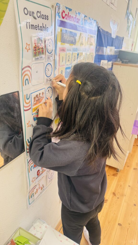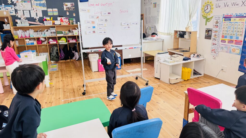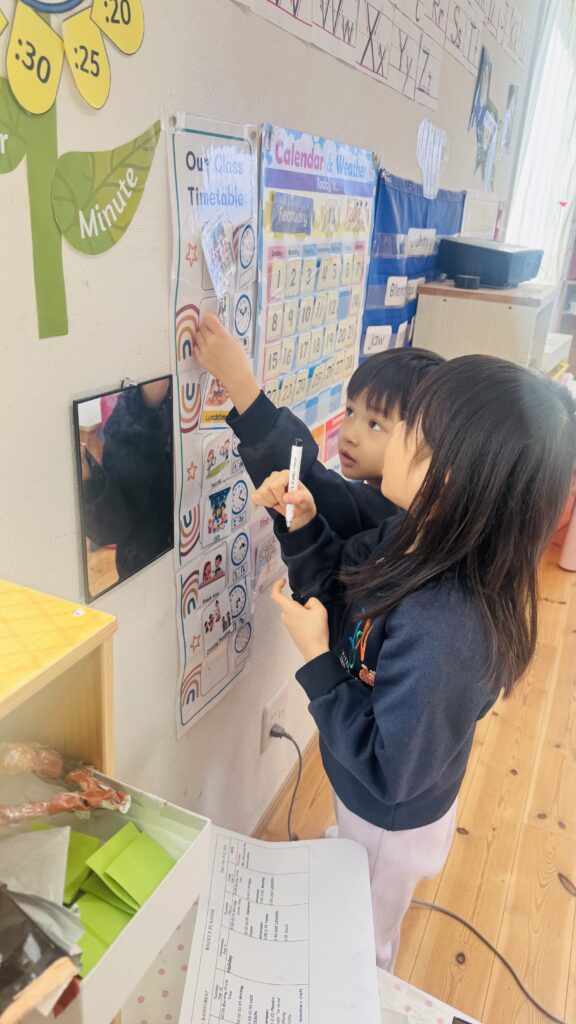 この役割を担うことで、子どもたちは責任感を育み、時間や一日の流れを意識できるようになり、また自信をもってクラスのみんなに伝える力を伸ばしています。
