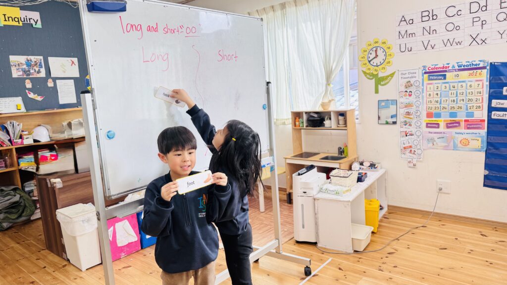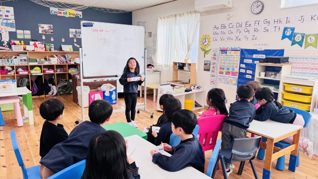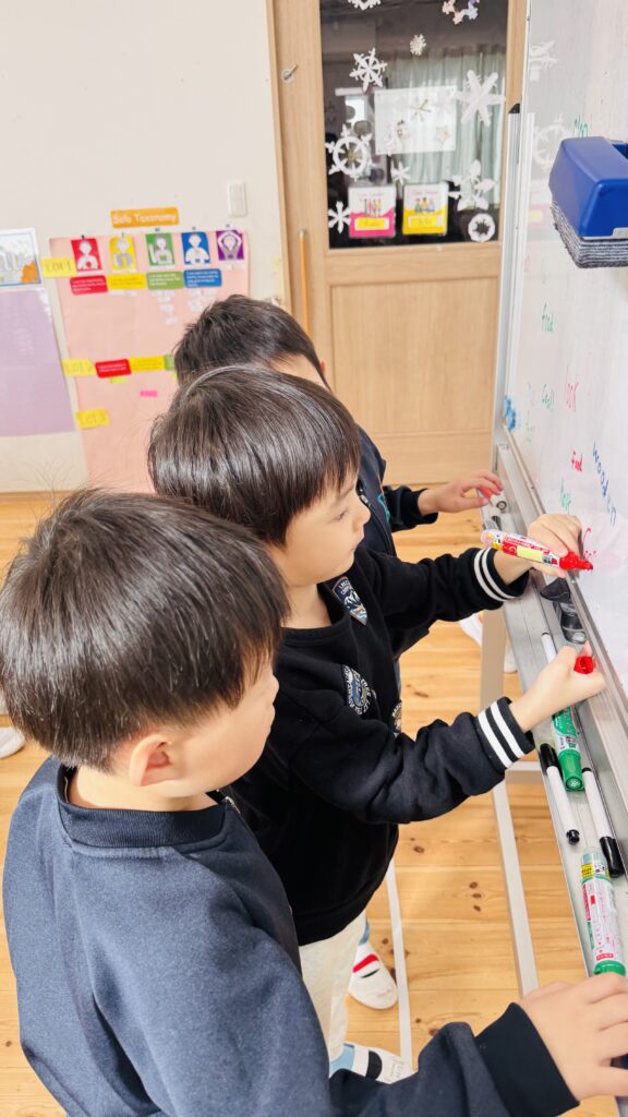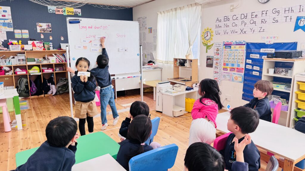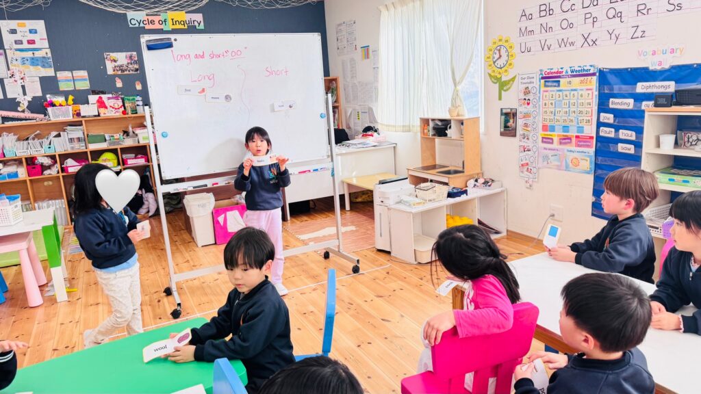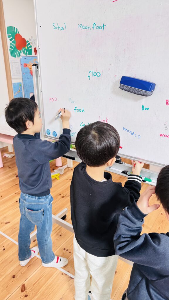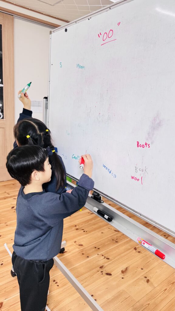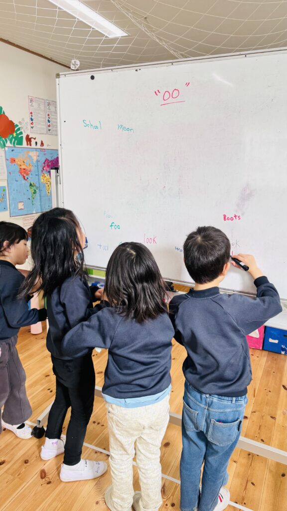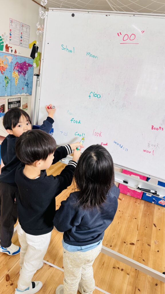 フォニックスのレッスンでは、長い音と短い音の二つの “oo” の発音について学びました。子どもたちは “oo” を含む単語の例をたくさん思い出し、それをホワイトボードに書き出しました。子ども達はこのアクテビティが大好きで、間違いをすることを恐れず、たくさんの単語を発表することを楽しんでいます。