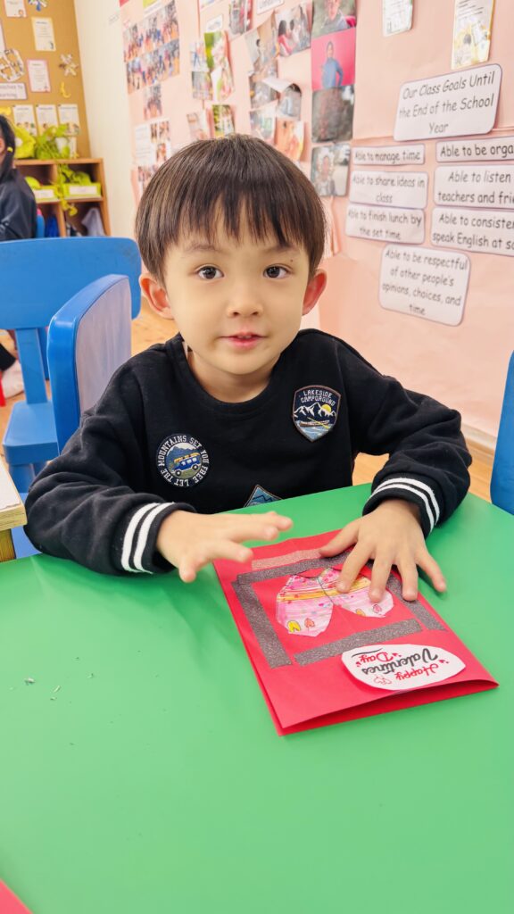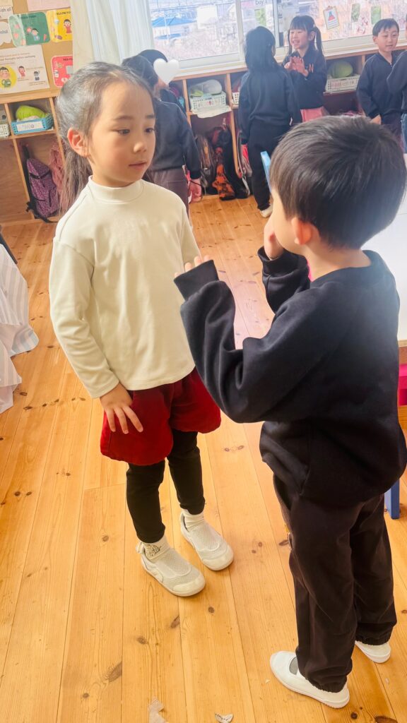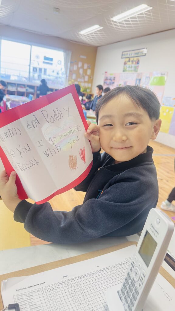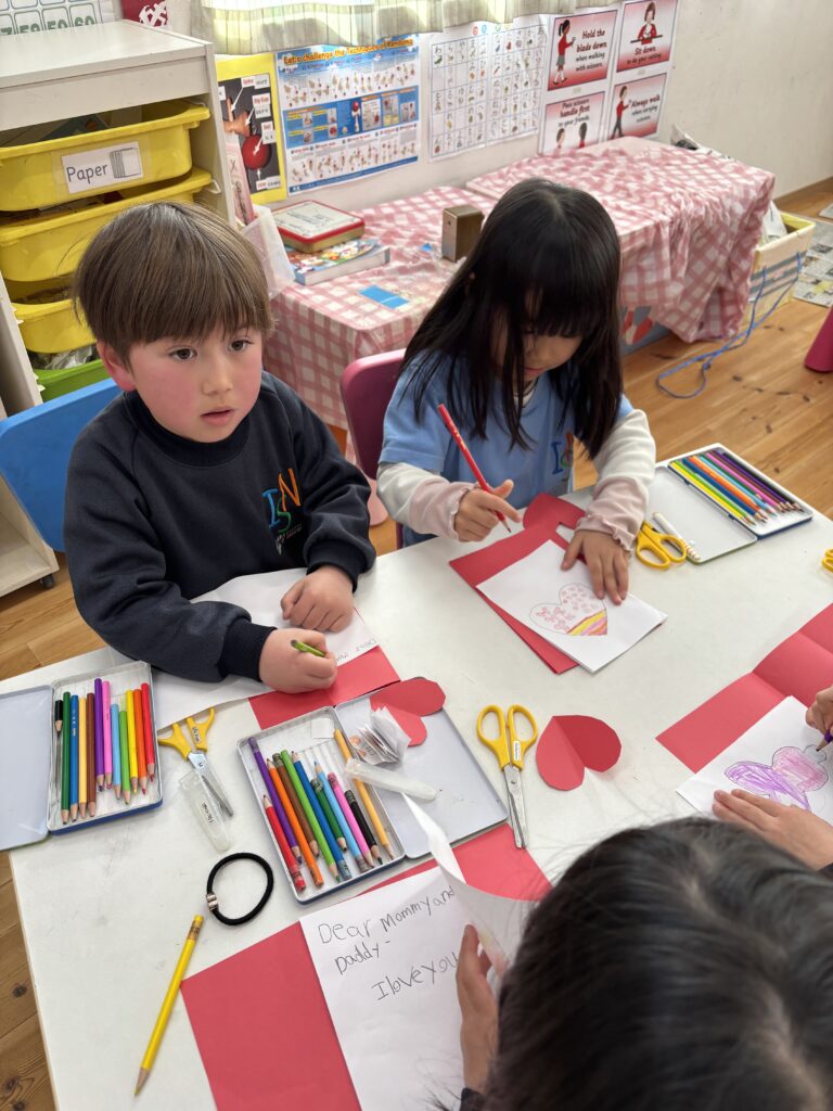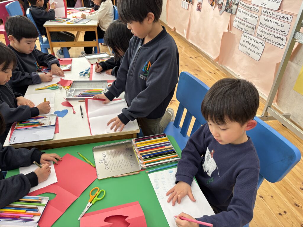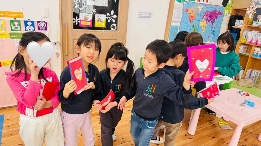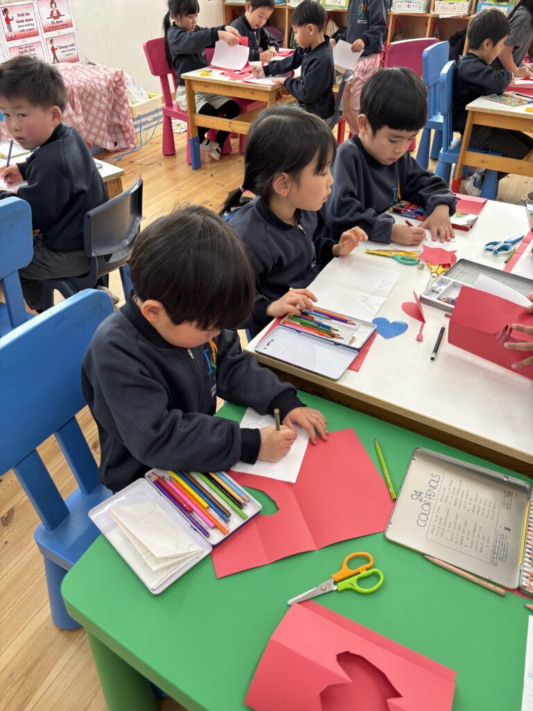 今週末はバレンタイン♡ 子ども達にどんな日か聞いてみると、「男の子が女の子にチョコをあげる日」、「友達とお菓子を交換する日」などの答えが返ってきました。「Celebrating Valentine’s day」という絵本を読み、欧米では家族、お友達、先生など、自分が大切に想っている人にカード、お菓子、ギフトなどを送る日だとわかりました。また、Ms. Aizaにも出身国のフィリピンでは、どのようにこの特別な日をお祝いするのか教えてもらいました。