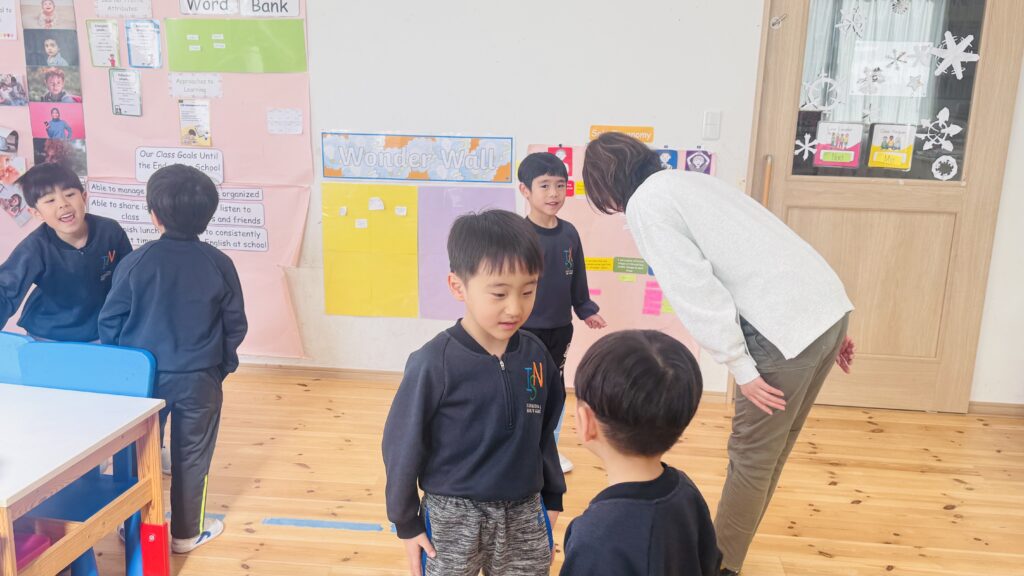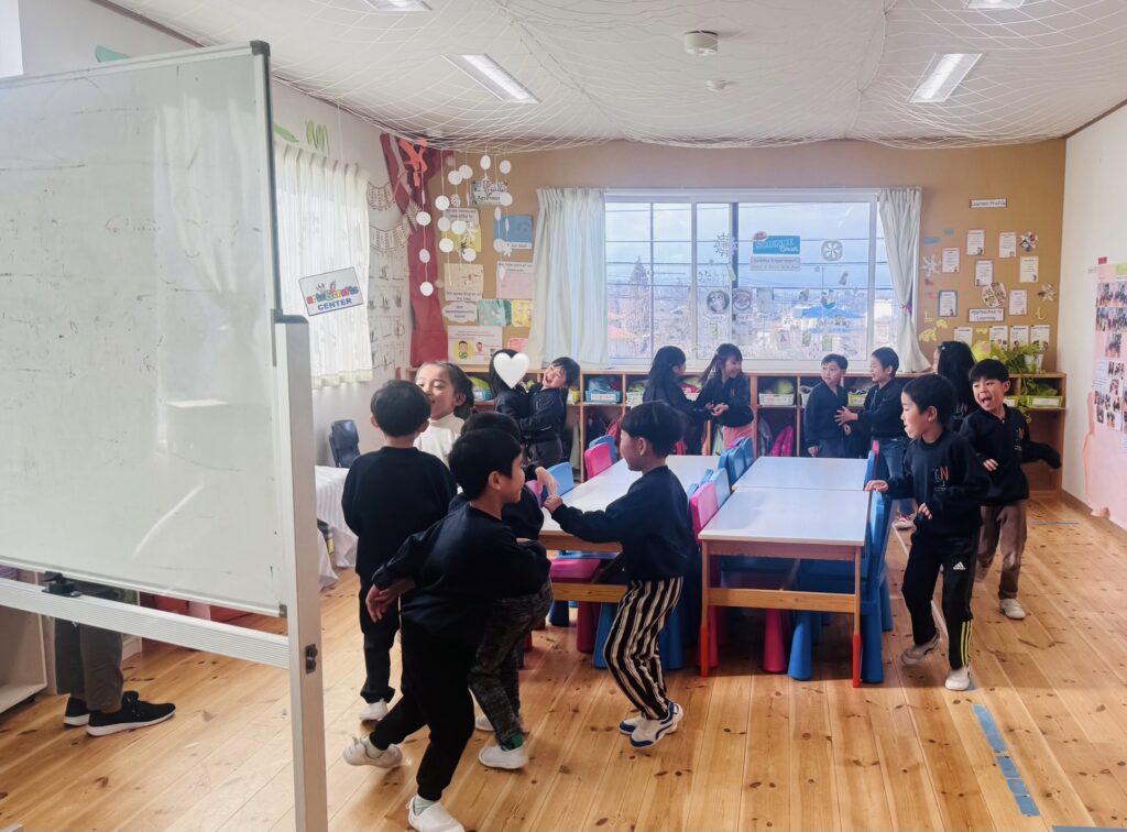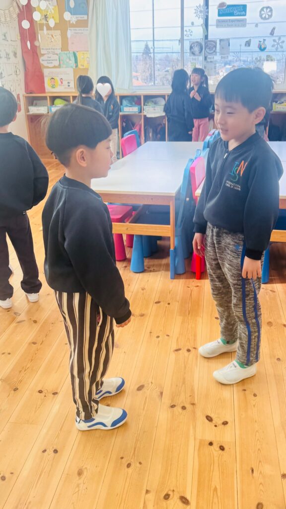 日本語のレッスンでは、「ぼくの/私の名前は〇〇です。ぼく/わたしは〇才です。」という表現を学び、音楽に合わせていて止まったらペアを組んで自己紹介をするというアクテビティをしました。普段英語で話している友達と日本語で話をするのは新鮮!お辞儀をしたり、「よろしくお願いします」と言ったり、とても丁寧なRainforestさん達です。