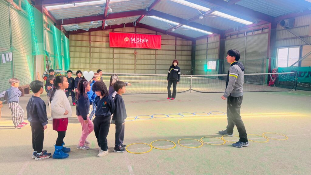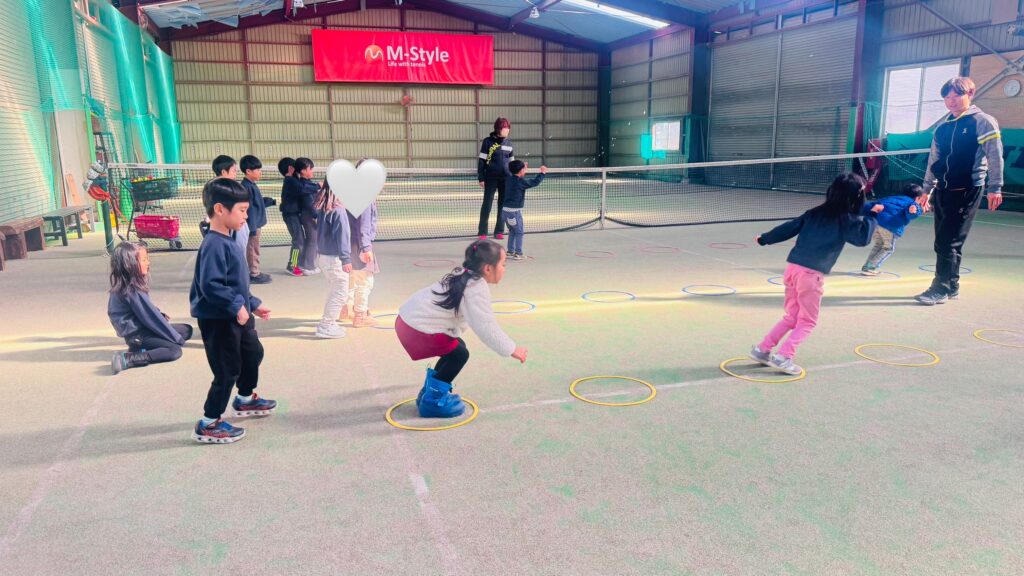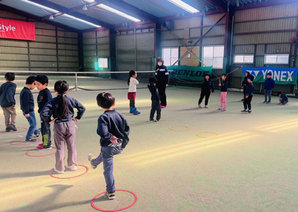 今週のテニスレッスンでは、まずグループごとにリングの上をジャンプするストレッチから始めました。リングをジャンプして跳んだり、中で足踏みをしたりしながら、テニスをする上で大切な足の動きを学びました。