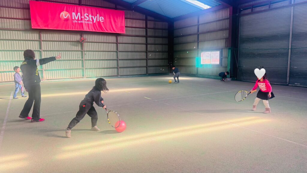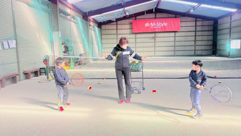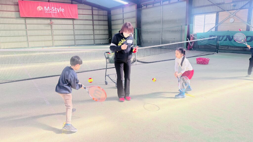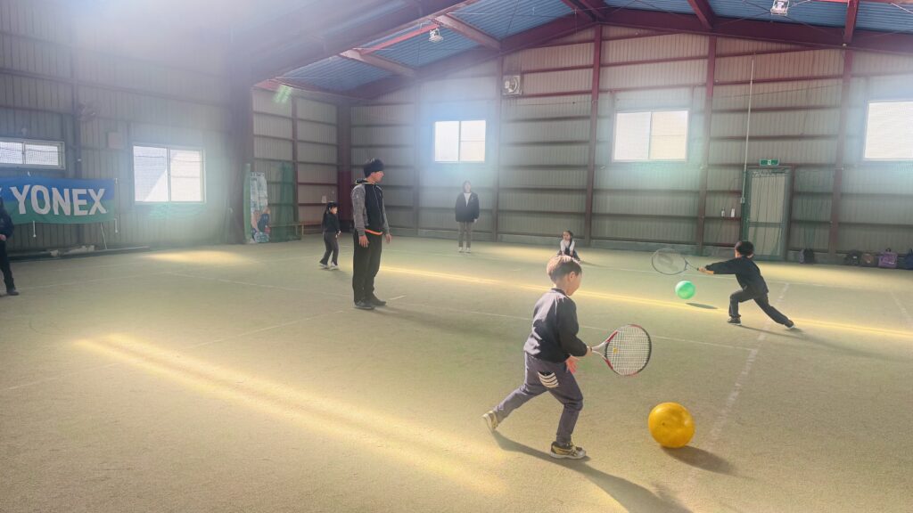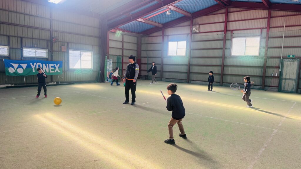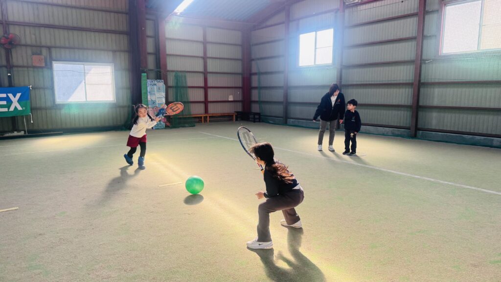 ストレッチの後は、ボールを正しく打つ練習を行いました。ラケットの正しい持ち方や、ボールをよく見ること、コントロールされたスイングを意識しながら取り組みました。子どもたちは順番にボールを打ち、先生が落としたボールをしっかりと見て、タイミングよく打つ練習をしました。レッスン中は終始一生懸命な子ども達!友だちと一緒にテニスのスキルを磨くことをとても楽しんでいます。