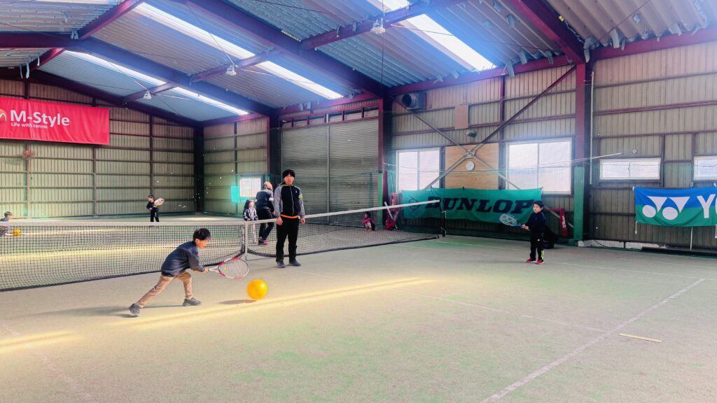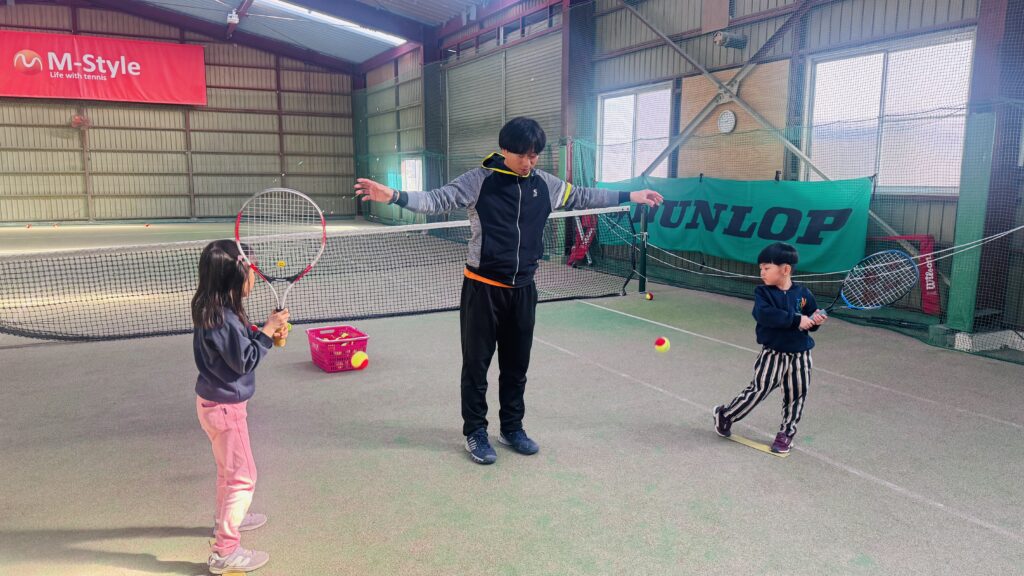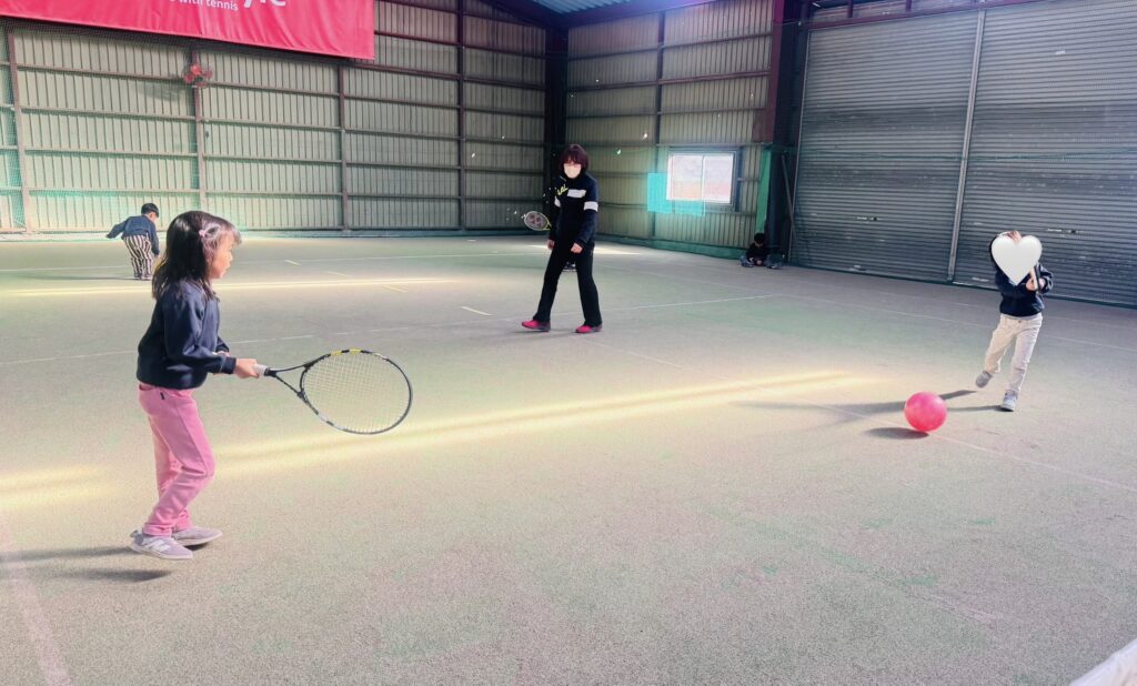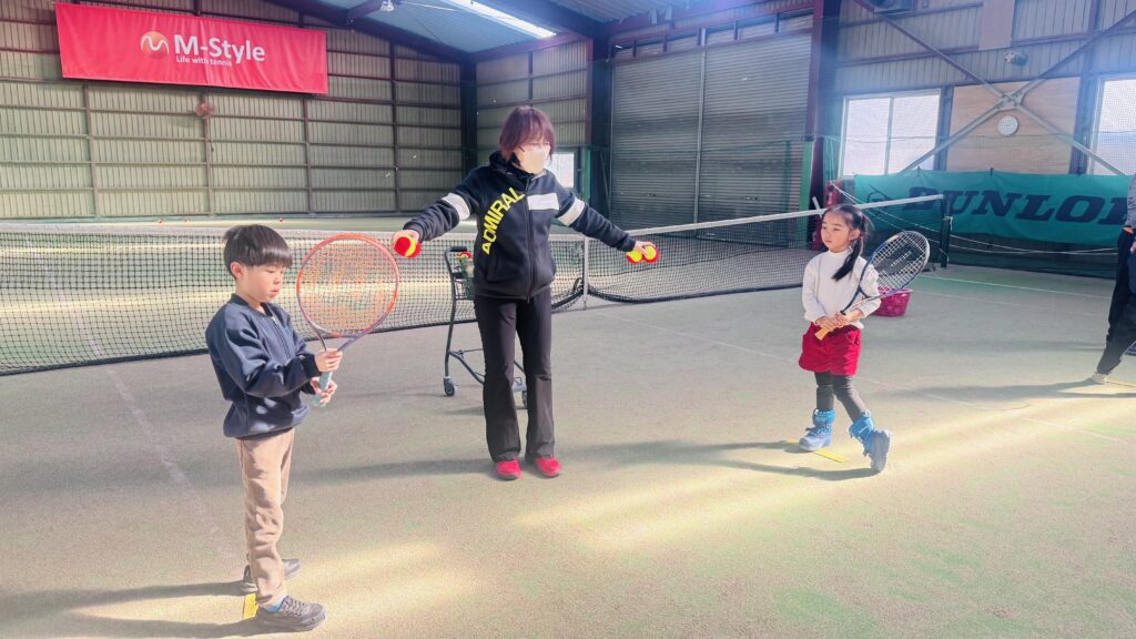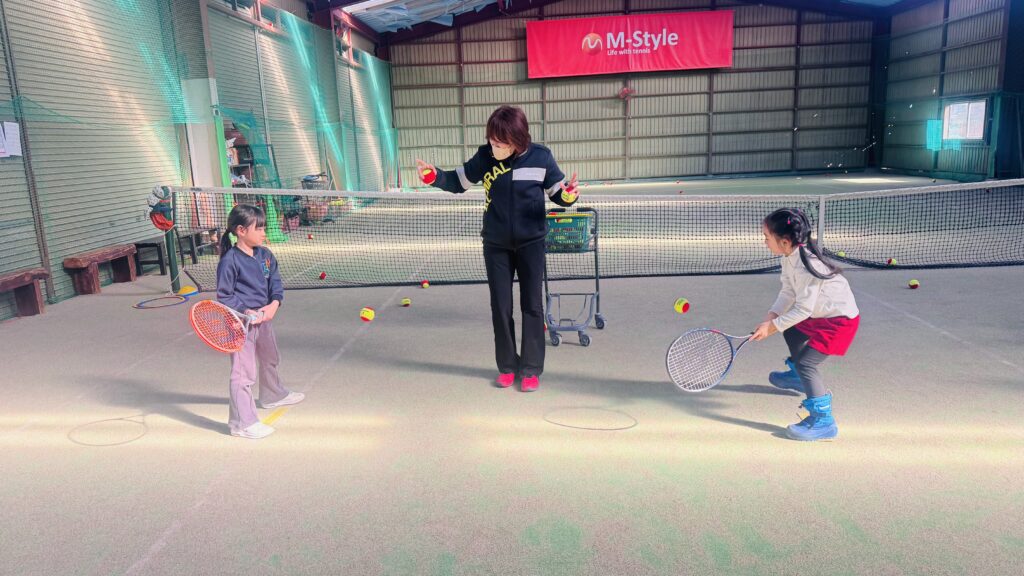 ストレッチの後は、ボールを正しく打つ練習を行いました。ラケットの正しい持ち方や、ボールをよく見ること、コントロールされたスイングを意識しながら取り組みました。子どもたちは順番にボールを打ち、先生が落としたボールをしっかりと見て、タイミングよく打つ練習をしました。レッスン中は終始一生懸命な子ども達!友だちと一緒にテニスのスキルを磨くことをとても楽しんでいます。