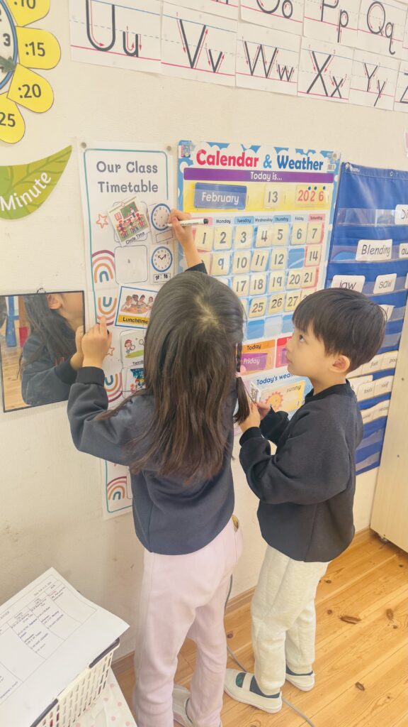 Each day, we have two helpers who check our daily schedule and keep track of the time. They help lead the class during clean-up time, bathroom breaks, lunch and snack time, and transitions to our outside activities such as the park, outdoor play, gym, swimming, music class, and tennis class. This role helps students develop responsibility, become more mindful of time and the day’s schedule, and grow into confident and effective class communicators.