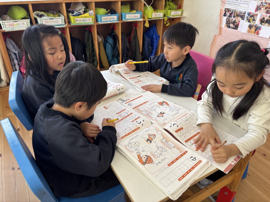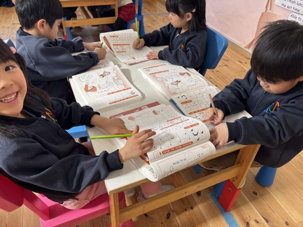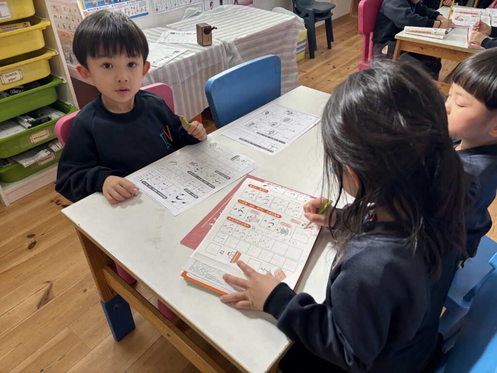 その後は、ワークブックで「ふ」の文字を書きました。ワークブックで練習する字はあと一文字!「あともう少しで終わりだよ!」と、子ども達はすでに沢山の文字を覚えたことにびっくりしていました。自分のお名前を書くことも、とても上手になりましたよ。