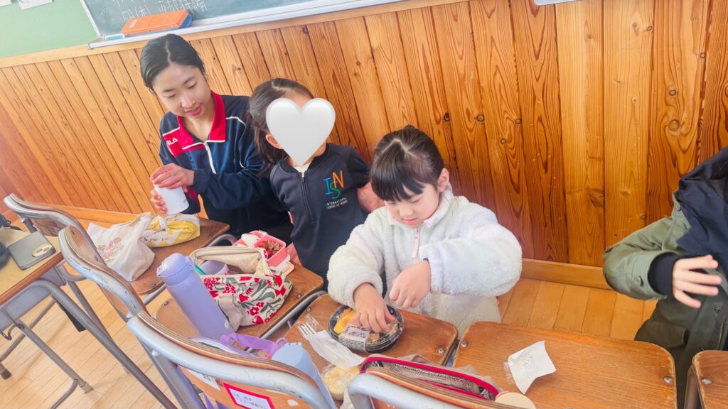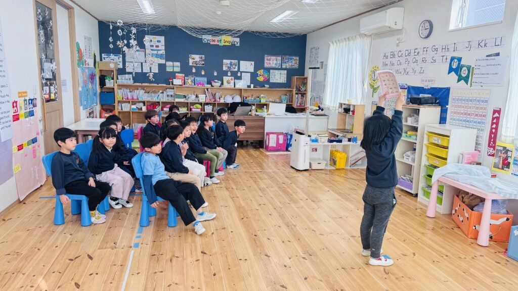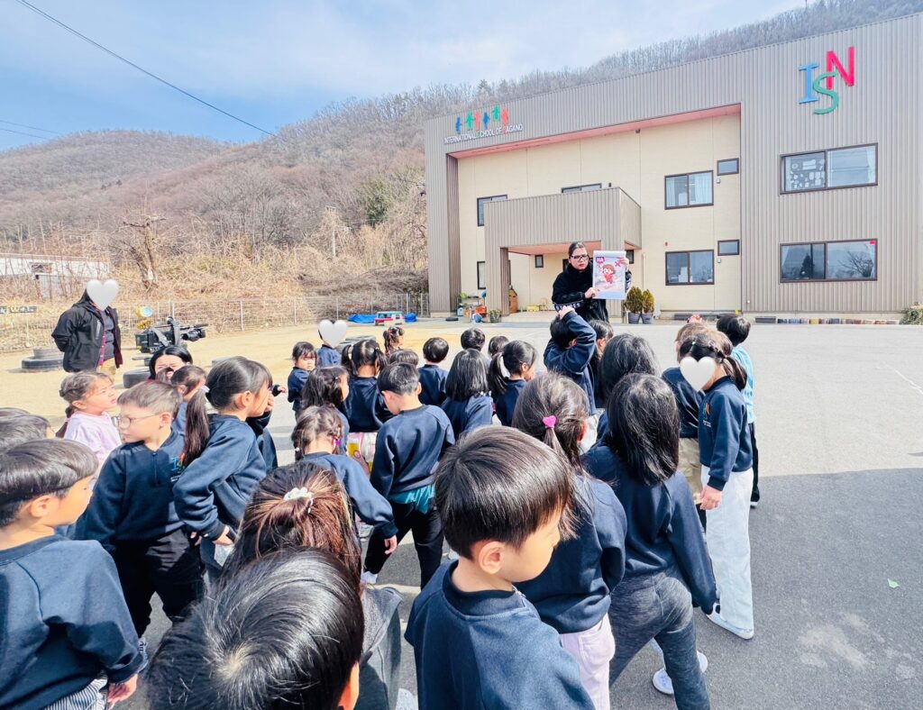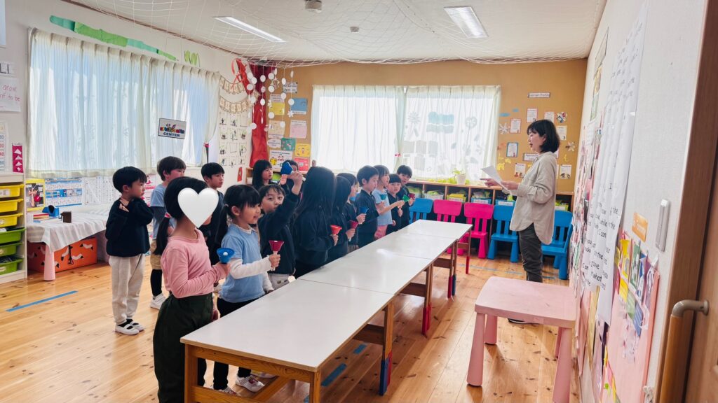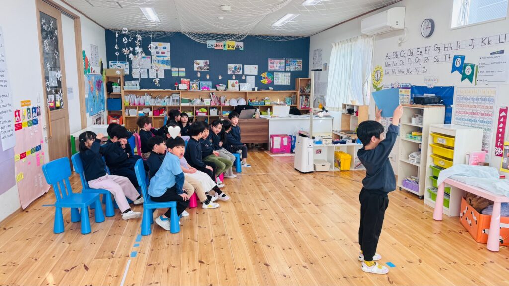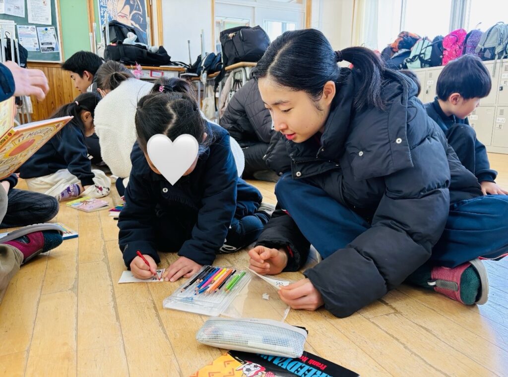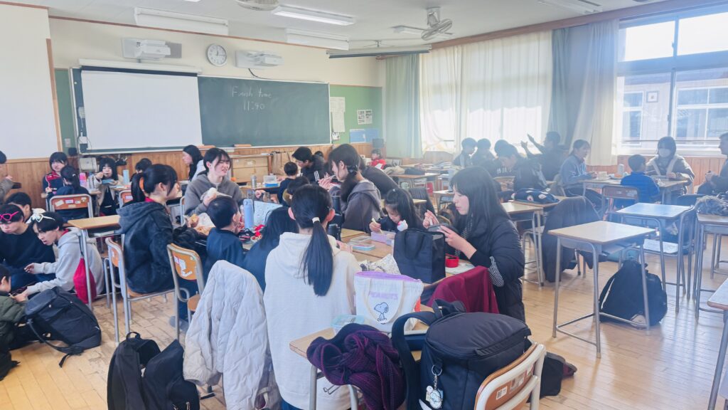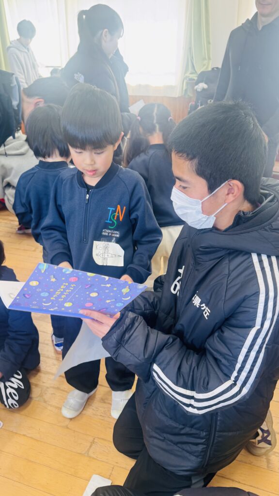 We had the opportunity to visit Agatagaoka High School for a special collaboration. To add more excitement to our visit, everybody agreed on one rule — an “English-Only Policy.” The Rainforest students learned a lot and had so much fun participating in various engaging activities, such as observing English and Geography classes, making name tags, reading English books, and drawing. Before eating lunch, they even helped clean up the classrooms, showing their thoughtfulness and cooperation. Then, they enjoyed lunch with the high school students. Their hearts were full of joy as they received a special present from them! To show our appreciation for their very warm welcome, our class said, “Thank you” and “We love you,” and presented them with a handmade bouquet of flowers. It was a wonderful day filled with learning, friendship, and fun memories that our students will treasure for a long time!