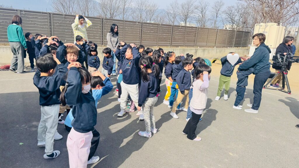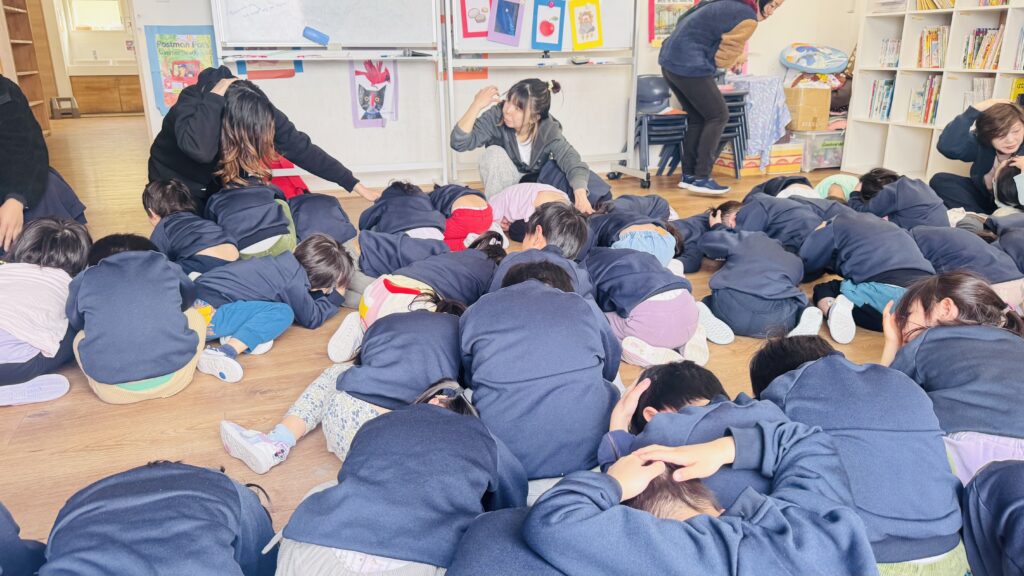 お誕生日会の直後には、予告なしの地震避難訓練を行いました。子どもたちがアラームを聞いたときにどのように行動するかを確認するためです。