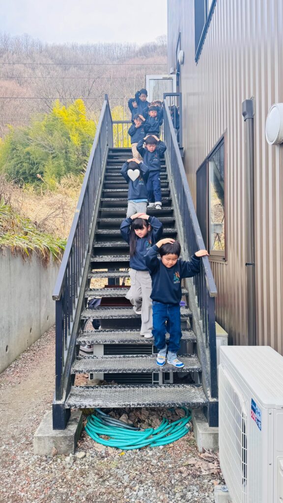 みんな落ち着いて行動し、指示をしっかりと守りながら、安全に決められた場所に避難することが出来ました。災害はいつどこで起こるかわかりません。子ども達は、建物2階から非常階段を使って安全に避難する方法を学びました。