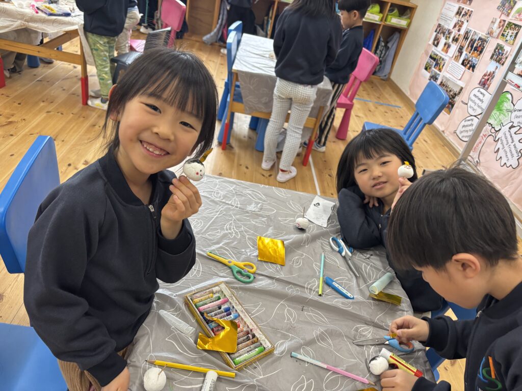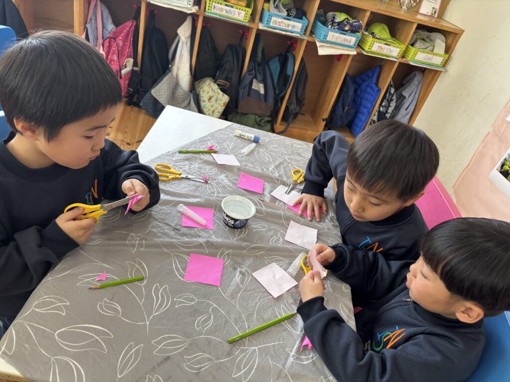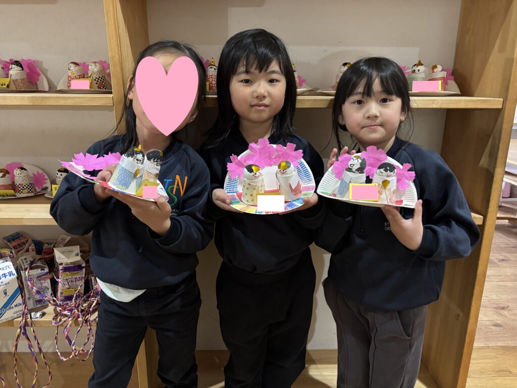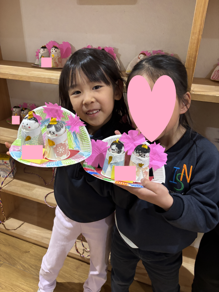 3月3日は桃の節句。ミュージックレッスンで「うれしいひな祭り」の歌を歌っているので、Rainforestさん達は、雛飾りにはどんな人たちがいるのかよく知っていました。更に、ひなまつりに関するお話を見て、3月3日に食べるちらし寿司に入っている具のそれぞれ意味や、ひなあられの色の意味などを学びました。細かい作業が上手になったRainforestさん達は、粘土、絵具、はさみ、マーカー、折り紙など様々な道具を使ってひな人形を完成させました。雪の結晶を折り紙で作った要領で桃の花を切ったり、絵具とマーカーで可愛らしいお雛様のお顔を作ったり、次の工程にする度に自分たちで何の道具か必要かよく考えながらとりくみました。どれも可愛らしいお人形が出来て、素敵なひな祭りを迎えられそうですね。