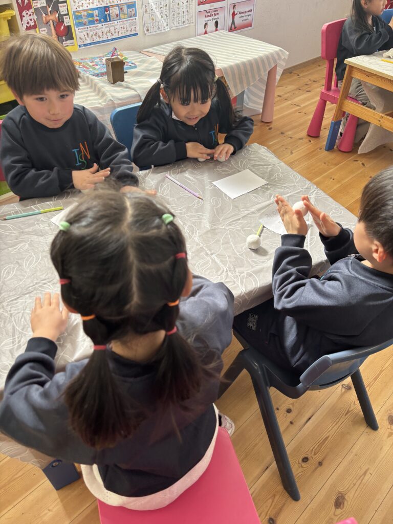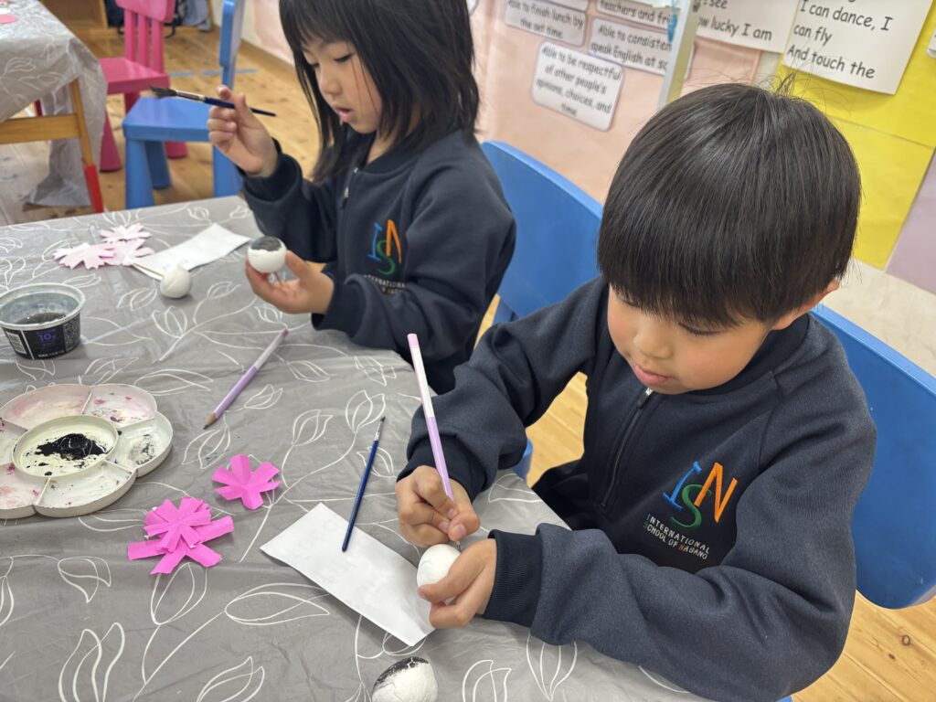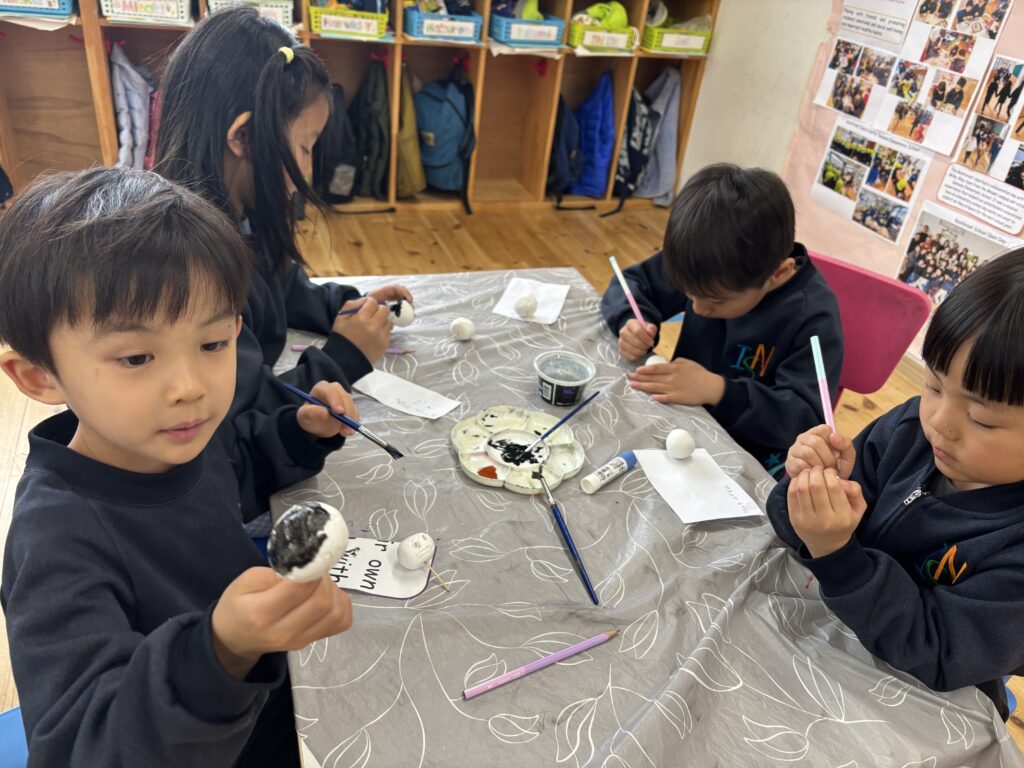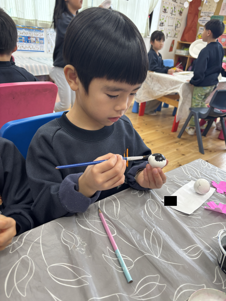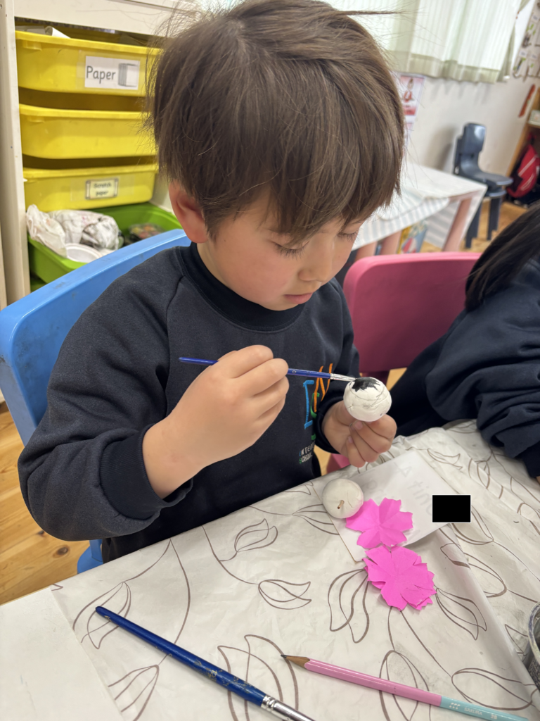 3月3日は桃の節句。ミュージックレッスンで「うれしいひな祭り」の歌を歌っているので、Rainforestさん達は、雛飾りにはどんな人たちがいるのかよく知っていました。更に、ひなまつりに関するお話を見て、3月3日に食べるちらし寿司に入っている具のそれぞれ意味や、ひなあられの色の意味などを学びました。細かい作業が上手になったRainforestさん達は、粘土、絵具、はさみ、マーカー、折り紙など様々な道具を使ってひな人形を完成させました。雪の結晶を折り紙で作った要領で桃の花を切ったり、絵具とマーカーで可愛らしいお雛様のお顔を作ったり、次の工程にする度に自分たちで何の道具か必要かよく考えながらとりくみました。どれも可愛らしいお人形が出来て、素敵なひな祭りを迎えられそうですね。