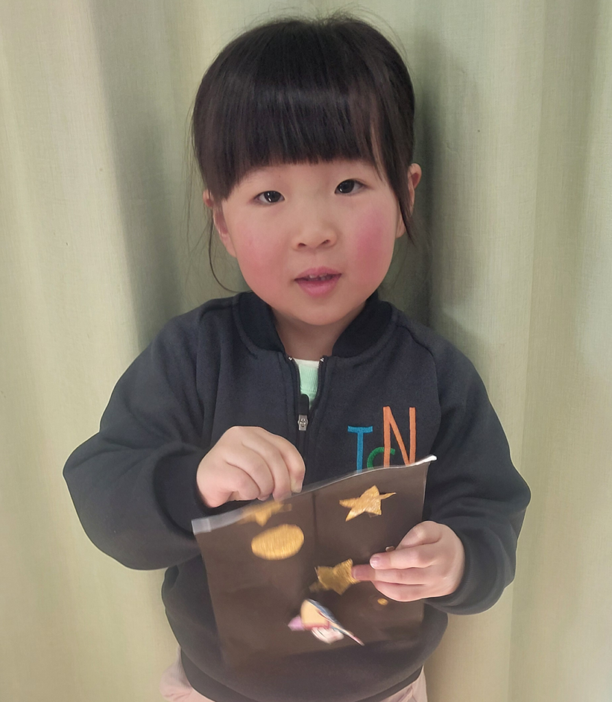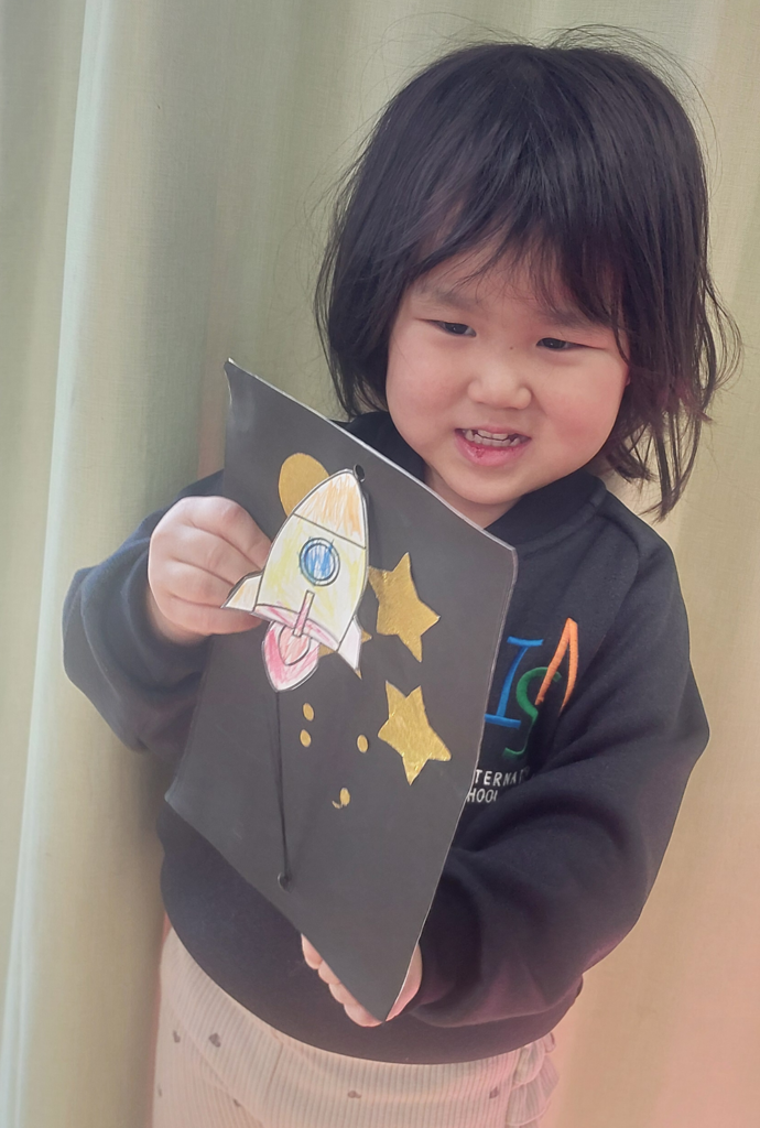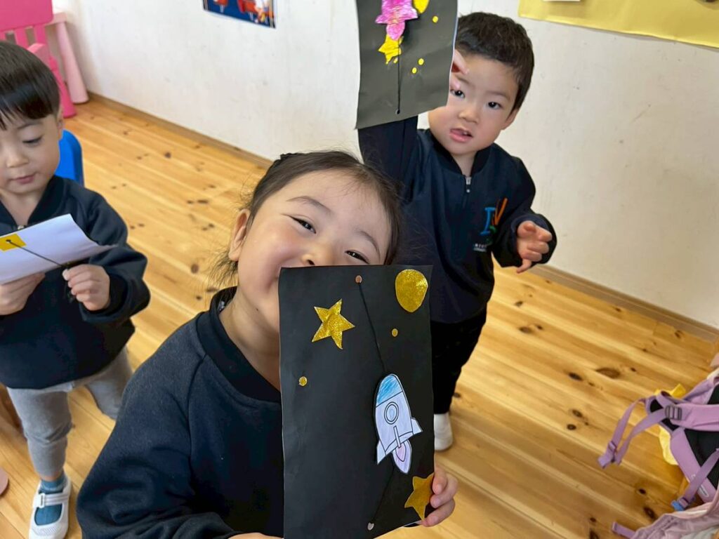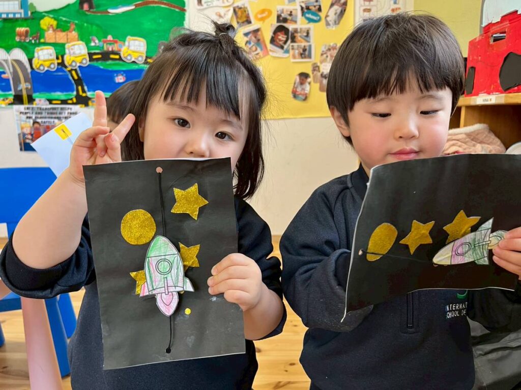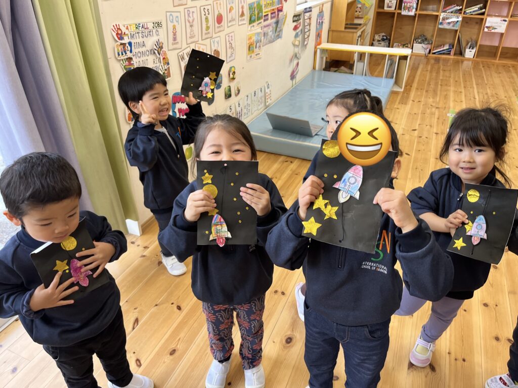 子どもたちは「宇宙!」「月まで!」と答えてくれました。Waterfallの子どもたちは、IBウォールに黒い宇宙を作り、そこに星や月を貼りました。そして、夜空を明るくするかわいいロケットを色ぬりしました。カウントダウンをして、ロケットを月へ発射!