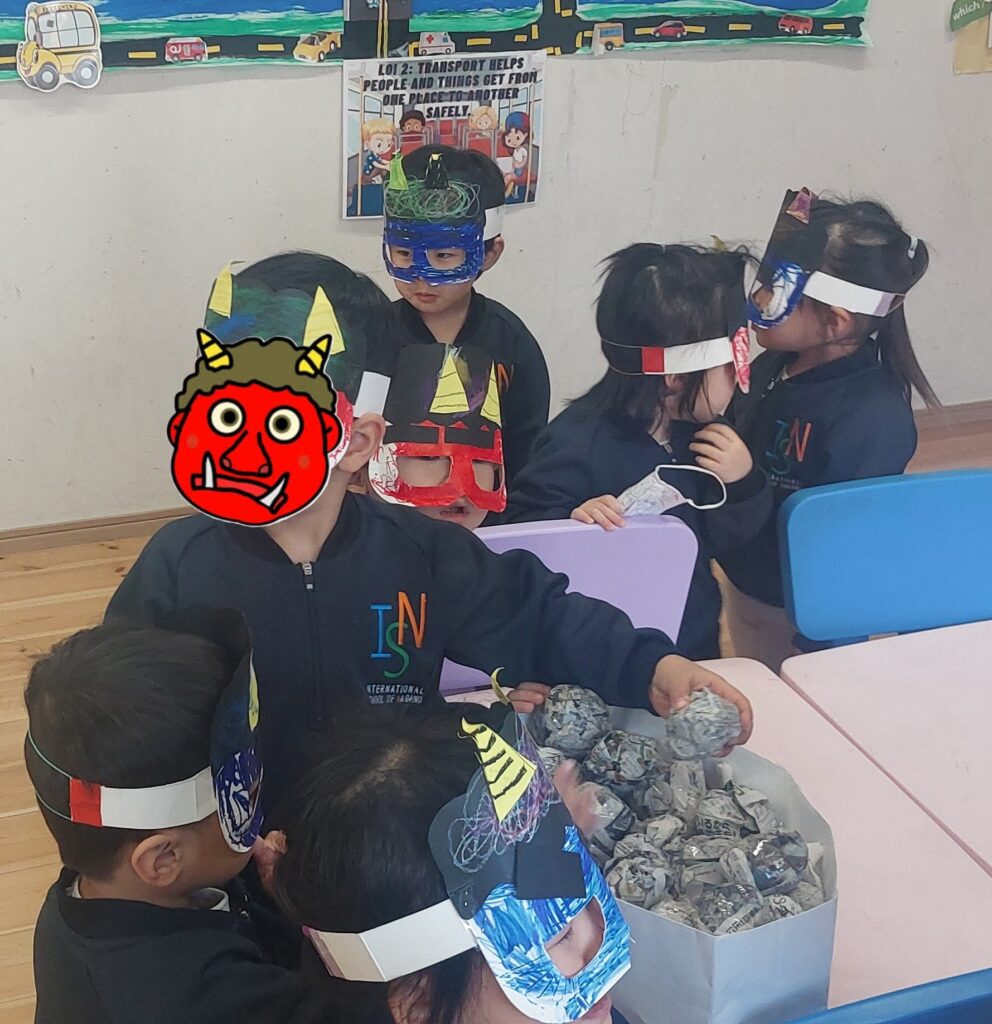 At the end of last week, students celebrated birthdays and learned all about defeating Oni! Now that everyone is prepared, Waterfall students popped on their scary masks and got ready for an unwanted Setsubun visitor. Oni ran in, but the students threw beans and shouted “Go Away!” in big, brave voices! Finally, Oni ran far away!