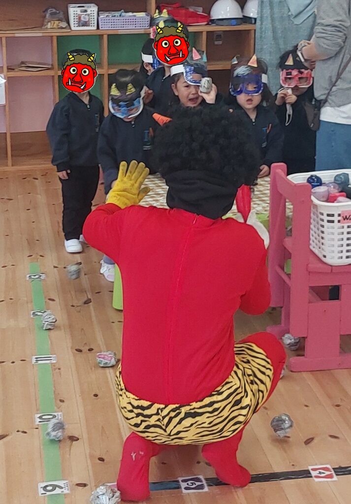 準備はばっちり!Waterfallの子どもたちは、こわ〜い鬼のお面をかぶり、招かれざる節分の訪問者を迎える準備をしました。恐ろしい鬼の登場に、恐怖で涙ぐみながらも、大きく勇気のある声で「おにはそとー!」と、新聞紙で作った豆を投げつけました。何度も豆を投げ、すると、鬼はついに遠くへ逃げていきました!