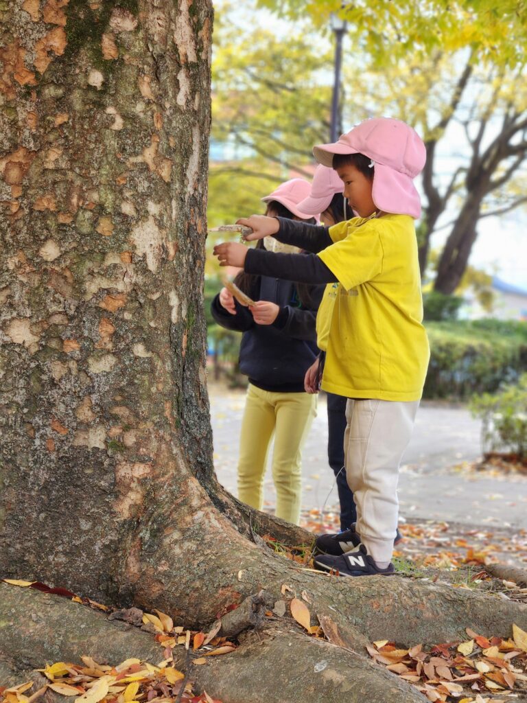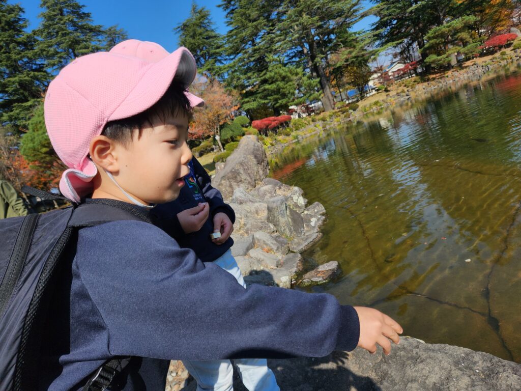 その後は外に出て、実際に生き物を探す探検タイム!Ms,Yumikoのお友達で、自然ガイドで鳥の先生でもある上条さんという方に、鳥の名前や木の種類をたくさん教えていただきました。また、一緒に池のコイにエサやりしたり、どんぐりの葉っぱで草笛を演奏してもらったり、大きなどんぐりが落ちている場所を教えてもらって大喜び!