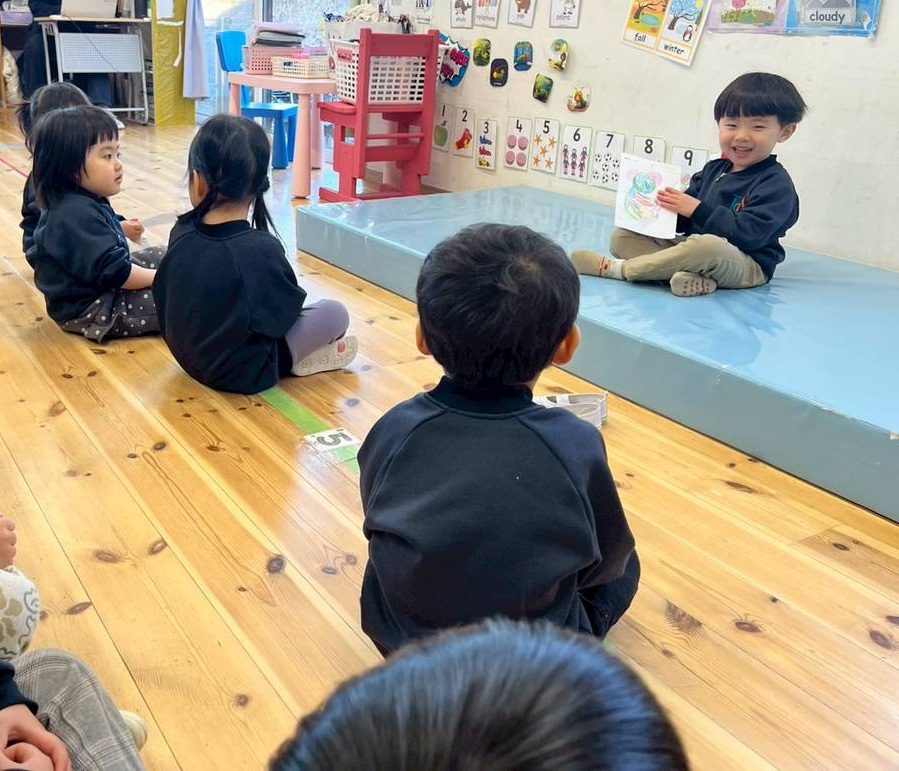 Waterfallクラスでは、これまで乗り物をテーマにしていたShow & Tellが終わり、これからは友だちに紹介したいものを自由に持ってくることができます。今週は、とてもワクワクした様子の2人の子どもたちが、自信をもって塗り絵や描いた絵を発表してくれました!