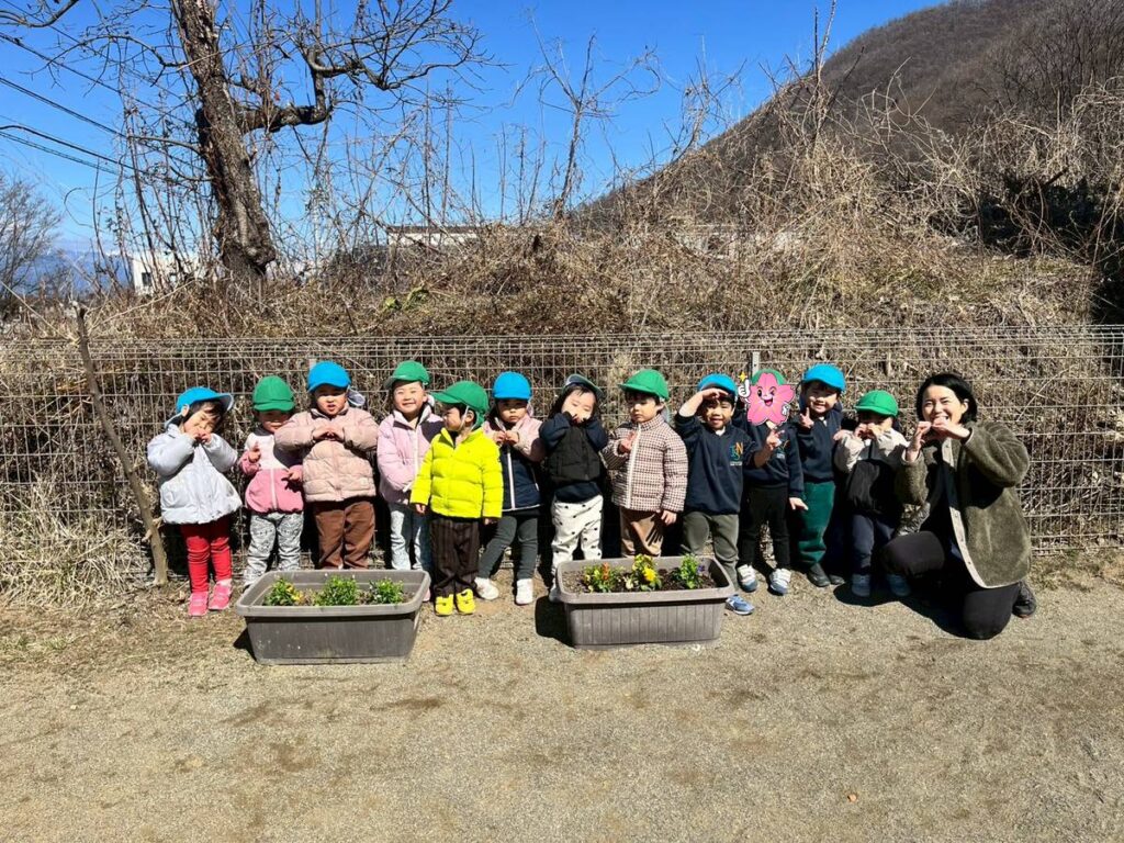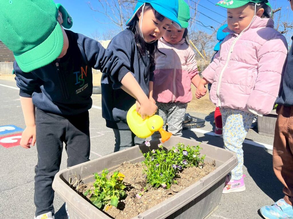 そして、「まだ外に花が咲いていないなら、自分たちで植えよう!」ということで、Waterfallの子どもたちは土を混ぜたり、穴を掘ったり、水をあげたりして、色とりどりのペチュニアを植えました。Thinkers(考える人)やCommunicators(伝える人)として協力しながら取り組む姿が見られました。「花が育つためには何が必要だろう?」という質問をすると、子どもたちは口々に「Water!」「Sun!」、「Sand…..? No, Soil!!」といままでの学びを振り返って答えてくれました。 Great job!!
