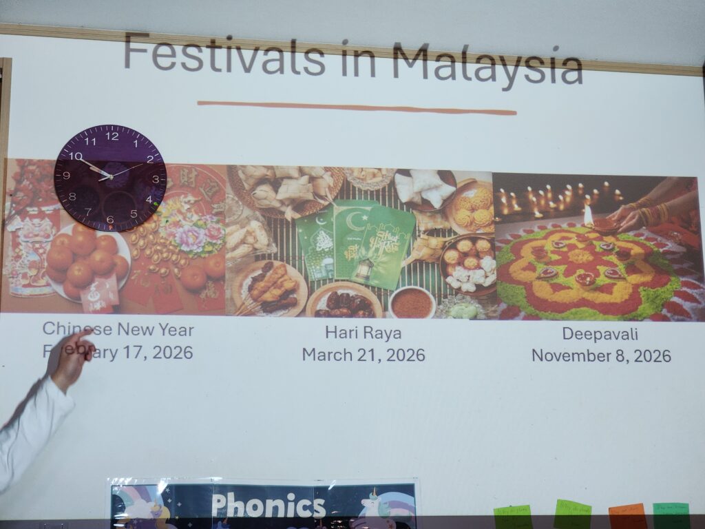 また水曜日には、生徒のお父さんである Mr. Cosmosをお招きし、マレーシアの「ハリラヤ」について教えていただきました。