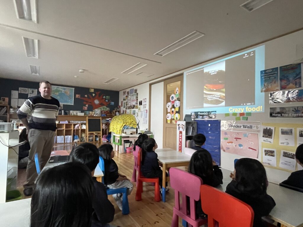 In addition to our discussions, we were fortunate to be visited by two of our American teachers from ISN: Mr. Josh of Gojo and Ms. Alex of Waterfall. They shared with us some of the most popular celebrations in the United States, including the State Fair and Thanksgiving.
