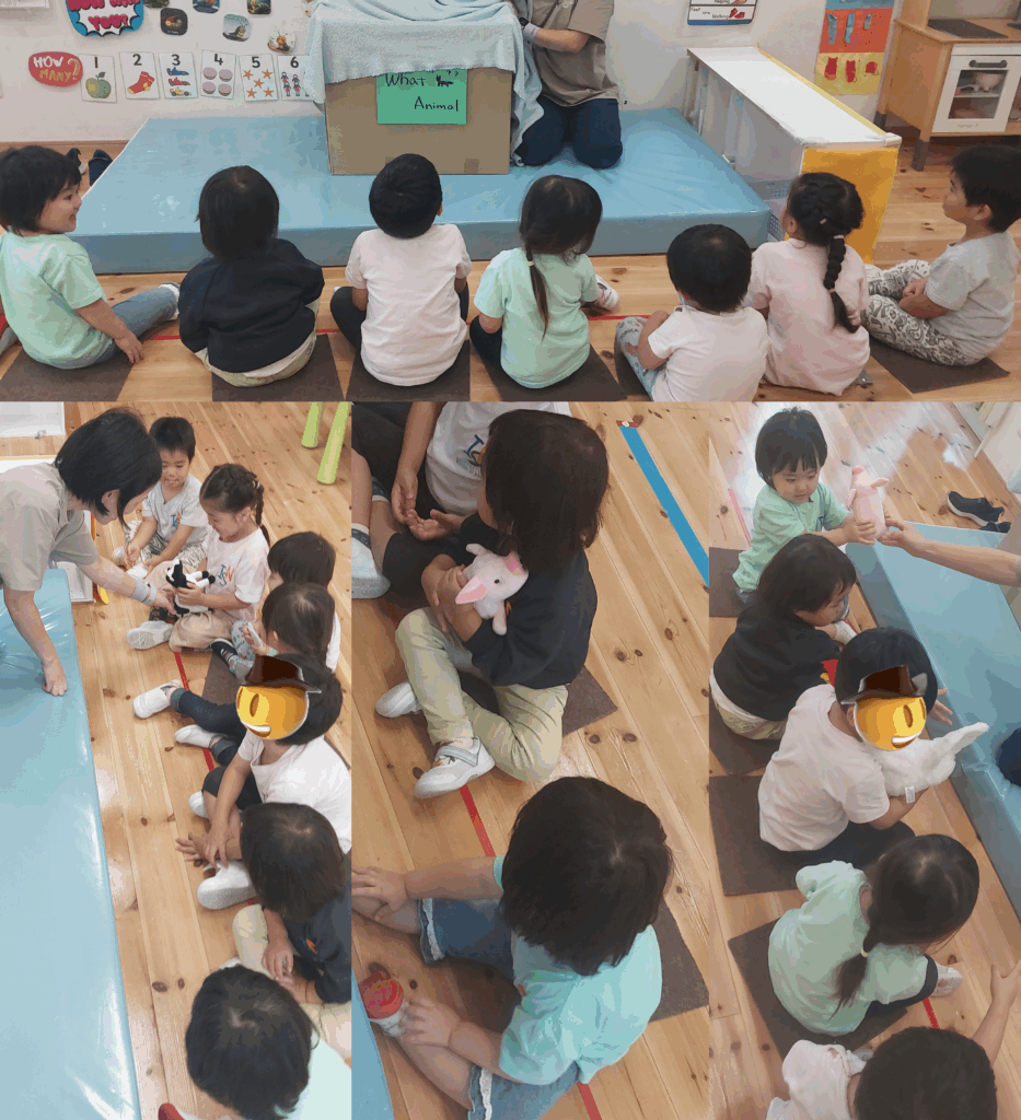 火災によって、犬や猫、牛など、いろいろな動物が逃げ出してしまうというハプニングも!Waterfallクラスのみんなは「アニマルハント」に出かけ、家にいる動物、陸や水、空にいる動物たちを見つけて元の場所に戻してあげました。見つけた動物の中には、人の生活を助けてくれる動物たちもいました。動物集めのあとはクイズタイム!