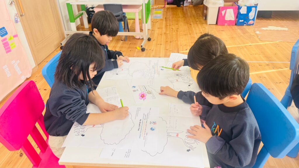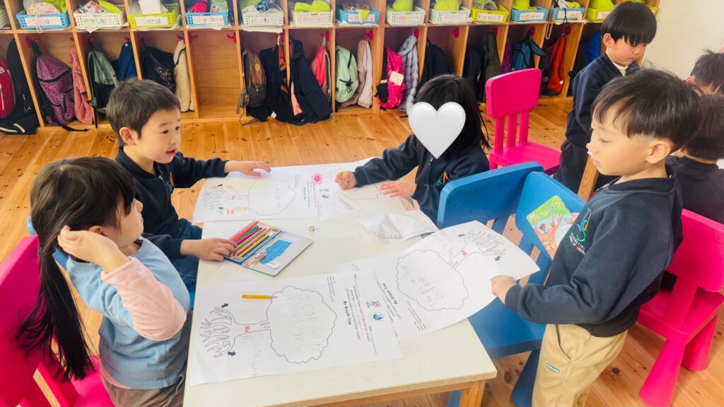 「成長」をテーマにしたレッスンでは、成長とは何か、そして誰が自分たちの成長を支えてくれているのかについて話し合いました。子どもたちは、保護者の方やおじいちゃん、おばあちゃん、いとこ、きょうだい、農家の人、そして「自分自身」など、たくさんの思いやりのある意見を出してくれました。周りの人たちの存在にしっかり気づいている様子が伝わり、とても素敵でした。