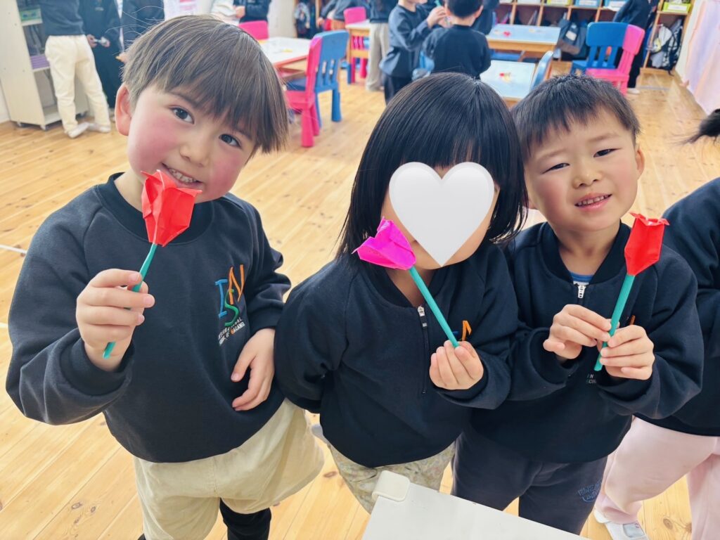 これから訪問する場所でお世話になる方たちの為に、感謝の気持ちを伝えるため何かプレゼントをしよういう事になりました。お花、ハート、メダルなどプレゼントしたい物はたくさん!まずはみんなで立体のチューリップを作りました。角を合わせておったり、折筋をしっかりとつけたりする事もとても上手になりました!みんなきれいなお花が折れて、とても満足していました。