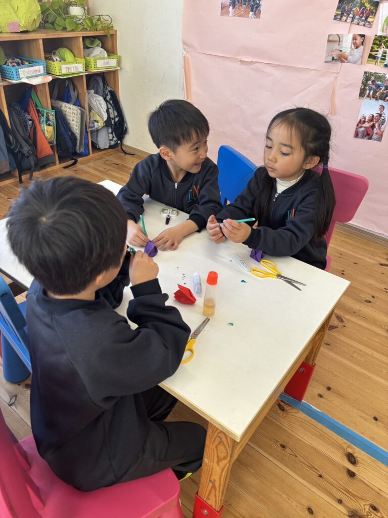 The children have become very good at matching the corners and making clear fold lines when folding. Everyone was able to create a beautiful flower and felt very proud and satisfied with their work. 🌷This hands-on experience helped develop their fine motor skills, focus, and creativity while giving them a sense of pride in their finished work.