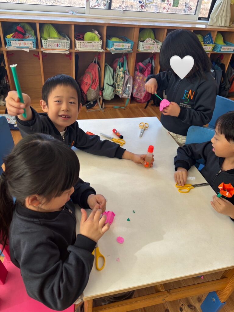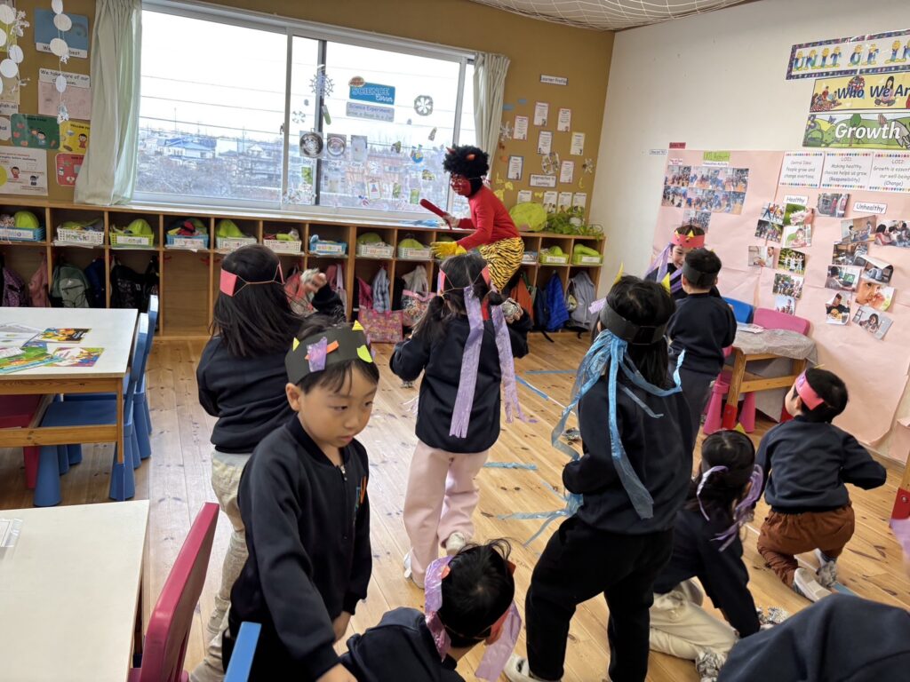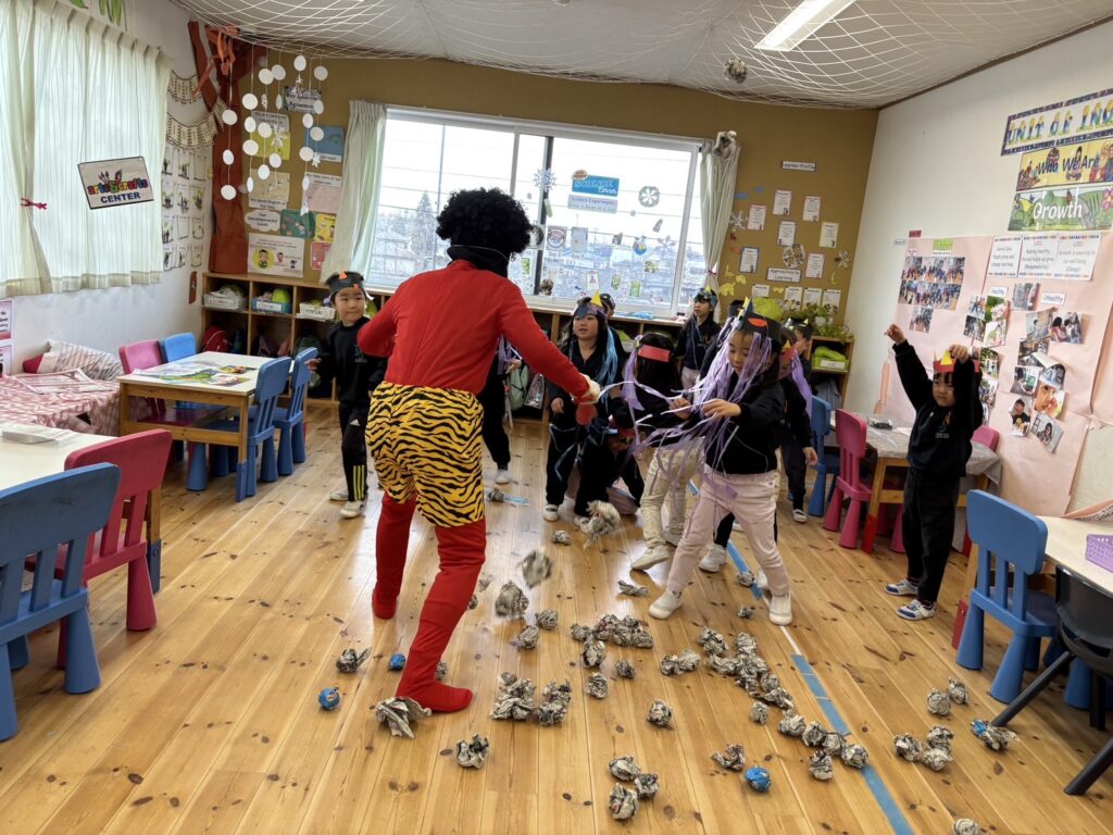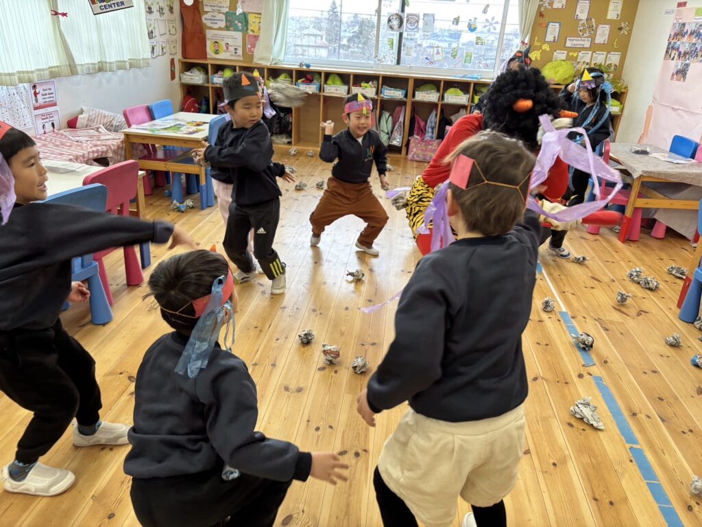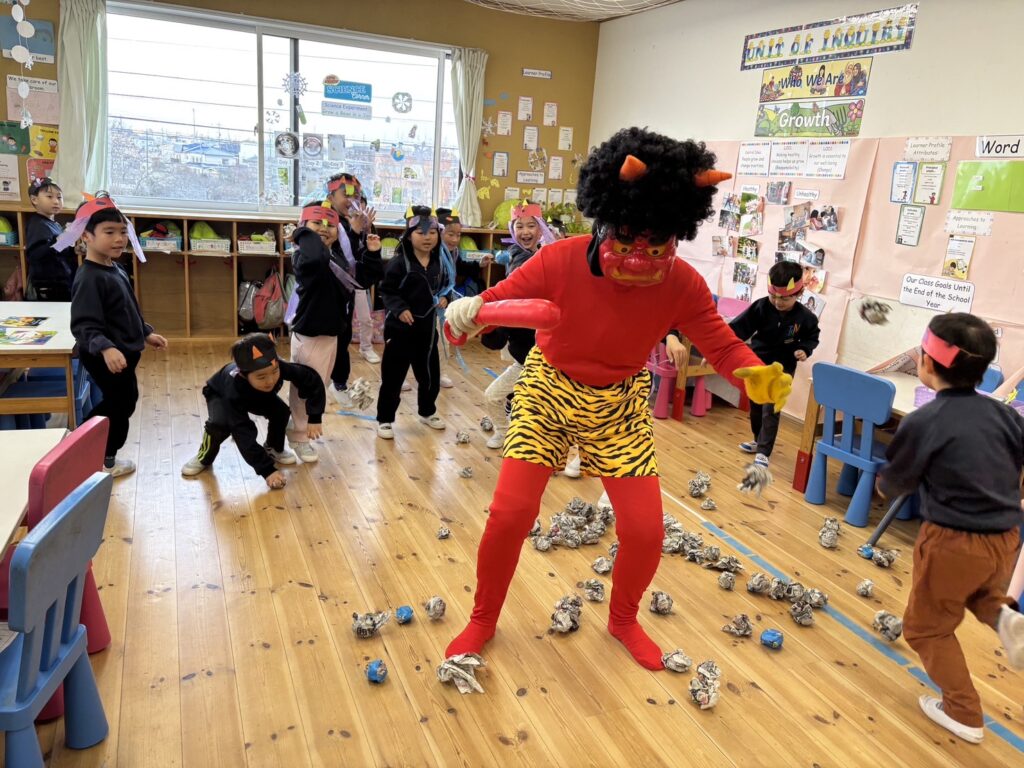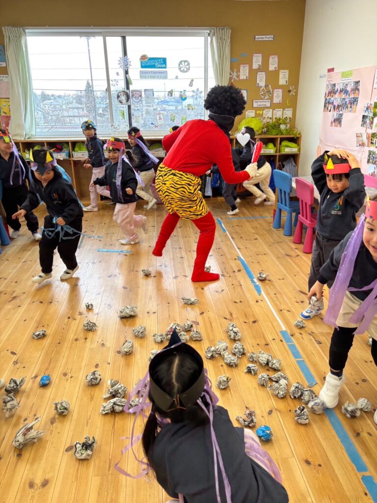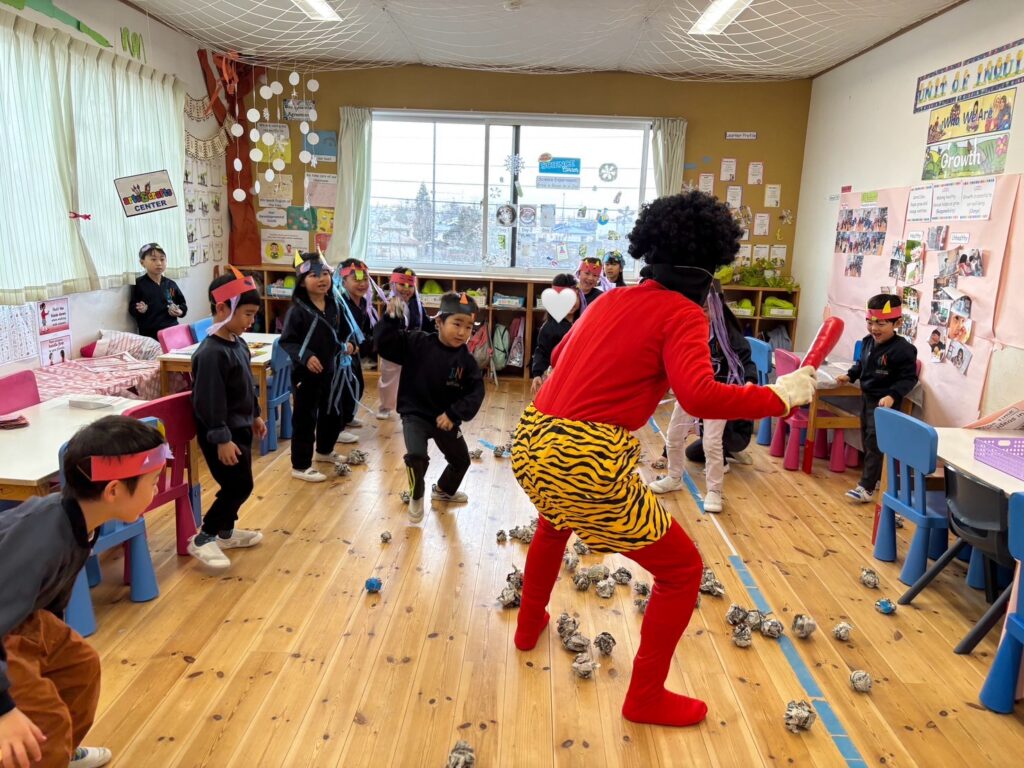 In class, we celebrated Setsubun, a traditional event that marks the arrival of spring and teaches us about inviting good fortune and driving away bad spirits. The children made their own “beans” by rolling up newspaper and energetically threw them at the oni who came to visit our classroom.