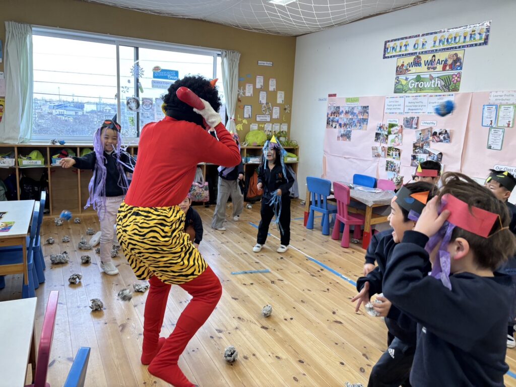 Although the Rainforest children bravely faced the oni, after it left, they carefully locked the classroom door to make sure it wouldn’t come back. They proudly shared that they had the courage to fight and chase away the “crybaby oni” and the “angry oni” inside themselves, looking very happy and accomplished.
